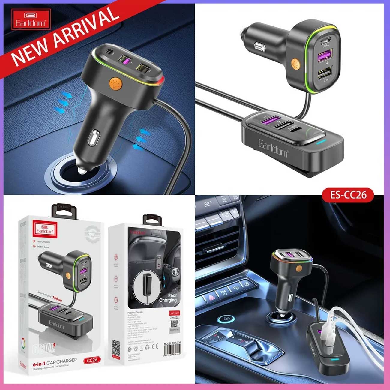 شارژر موبایل داخل ماشین CC26 دارای 6 خروجی 4 درگاه USB و دو درگاه Type-C با حداکثر توان 66 وات. است و امکان اتصال 6 دستگاه همزمان را فراهم می نماید. این درگاهها بسیار کاربردی هستند و شارژر با انواع دستگاهها سازگاری دارد.
