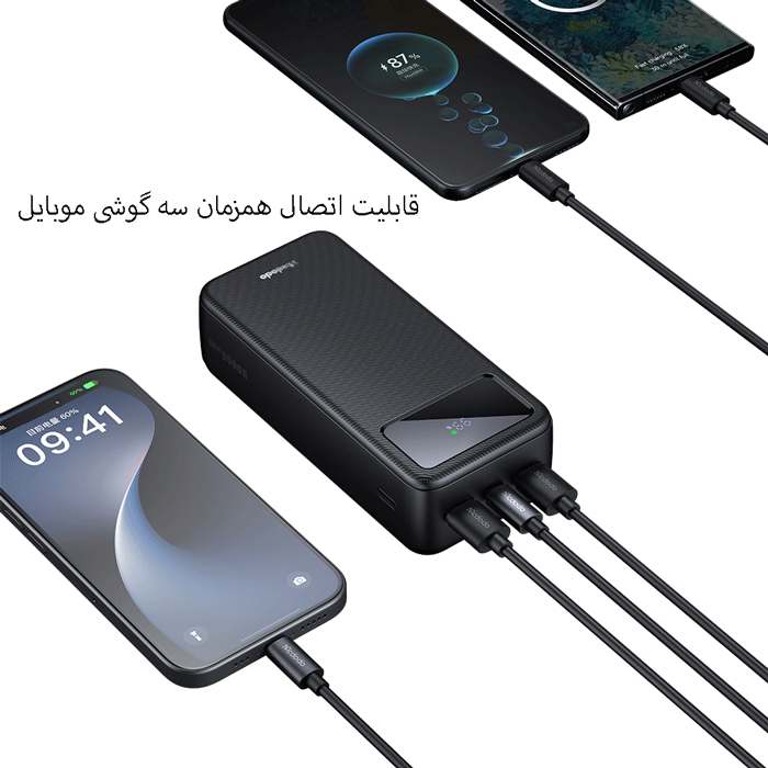 این پاوربانک 30000 زیبا دارای یک پورت Type-C که به عنوان ورودی و خروجی استفاده میشود و دو خروجی USB است.