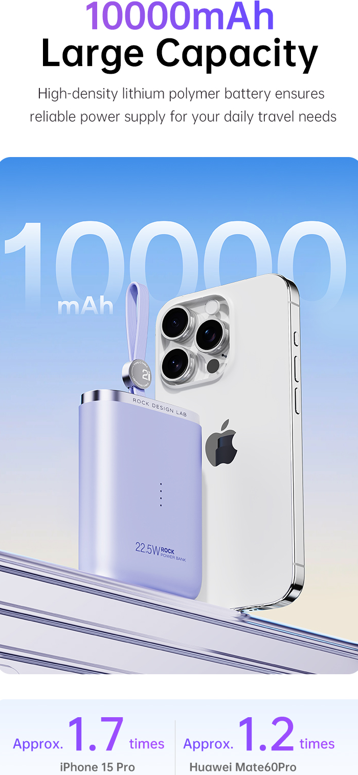 مینی شارژر راک با ظرفیت 10000 میلی آمپر ساعت، قادر است تا انرژی کافی برای شارژ دستگاههای مختلف را فراهم کند. با توجه به استفاده از باتریهای لیتیم پلیمری با چگالی بالا، RWC-8888 میتواند تقریباً 1.7 بار آیفون 15 پرو و 1.2 بار هواوی میت 60 پرو را شارژ کند. این ویژگی به شما این امکان را میدهد که در سفرها و فعالیتهای روزمره، نگرانی از بابت شارژ دستگاههای خود نداشته باشید.