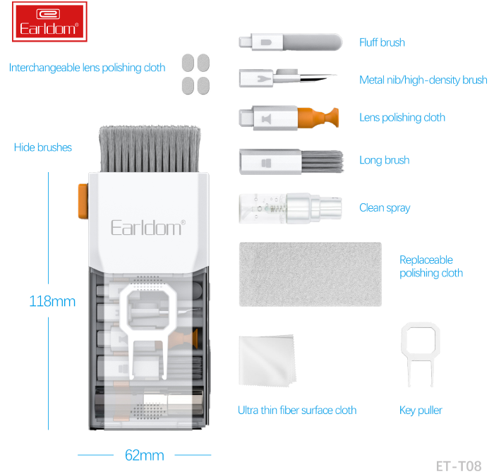 کیت تمیز کننده ایرپاد، کیبورد و گوشی موبایل ارلدام Earldom ET-T08 8-IN-1 CLEANING KIT نه تنها یک ابزار ضروری برای نگهداری از دستگاههای الکترونیکی شما است، بلکه به شما این امکان را میدهد که با حداقل زمان و تلاش، از تمیزی و زیبایی دستگاههای خود لذت ببرید. با تهیه این کیت جامع از سایت جانبی، میتوانید به راحتی چندین دستگاه را تمیز کرده و از کارایی بالای آنها بهرهمند شوید.
