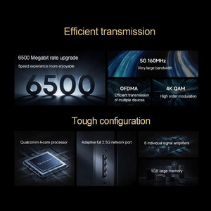 این روتر دارای 4 عدد پورت شبکه LAN با سرعت 2.5G است و از یکپارچه سازی پورت های LAN/WAN به صورت دوگانه و رسیدن به پهنای باند تا 5 گیگابیت در ثانیه پشتیبانی می کند. همچنین میتوانید پورت شبکه IPTV و پورت شبکه eSports را برای اتصال مستقیم به تلویزیون، رایانه شخصی و کنسولهای بازی پیکربندی کنید. روتر دارای 6 آنتن داخلی با بهره بالا است و از الگوریتم تصحیح خطا LDPC پشتیبانی می کند. این باعث می شود، دستگاه پوشش شبکه گسترده تر و عملکرد بالاتر انتقال داده را فراهم کند.