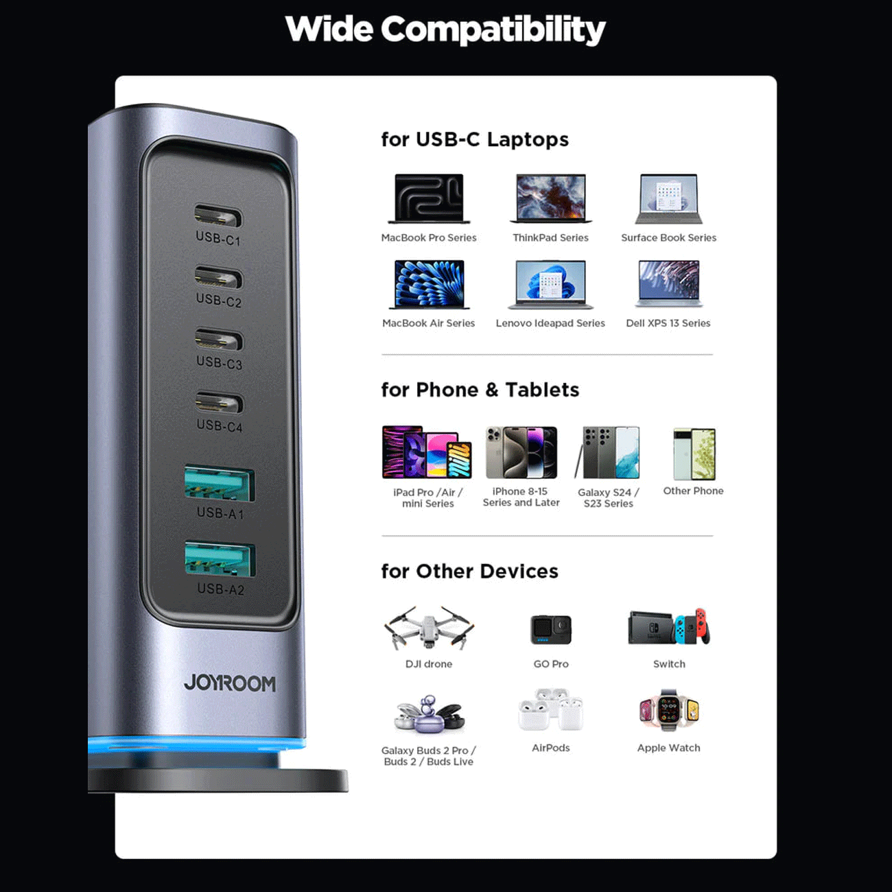 هاب شارژر جویروم از مواد با کیفیت که در برابر ضربه و آسیب بسیار مقاوم می باشد، ساخته شده. وزنی معادل 223 گرم و ابعاد 49.8*74.8*108.5 میلی متر دارد. جمعوجور بوده و حمل آن آسان است. دارای دو پورت USB-A و شش درگاه USB-C است و شارژر همزمان 6 دستگاه را برایتان فراهم میکند.