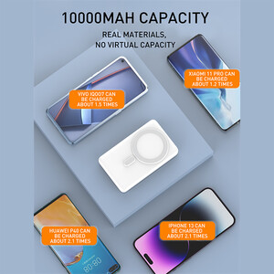 | امکانات و قابلیتها | پاوربانک مغناطیسی، شارژ سریع، هولدر گوشی مکانیزم مغناطیسی، MagSafe پاوربانک قدرتمند، ظرفیت بالا 10000 میلی آمپر ساعت پشتیبانی از شارژ بی سیم 15 واتی ، لمس نرم و ضد لغزش |