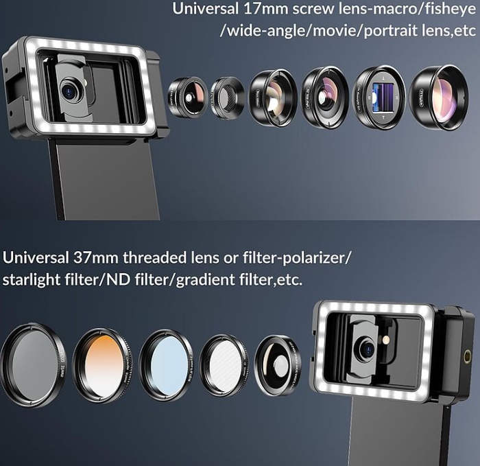 در وسط گیره نگهدارنده لنز گوشی موبایل Apexel APL-FL23، دو رزوه M17 و M37 برای اتصال لنزهای مختلف مانند فیلترهای ماکرو، فیش آی، CPL، ND، و زاویه باز تعبیه شده است. با اتصال لنز به این گیره، میتوانید به دنیای جذاب عکاسی ماکرو وارد شوید و از جزئیات حشرات ظریف، گیاهان، آشپزی، هنر ناخن و جواهرات پیچیده بهرهمند شوید. همچنین، امکانات خلاقانه را با لنزهای چشم ماهی و زاویه باز برای مناظر مسحورکننده و پرترههای جذاب کاوش کنید. (نکته قابل توجه: در بسته بندی محصول لنز وجود ندارد.)