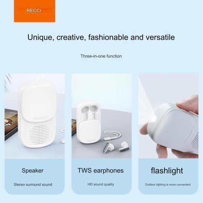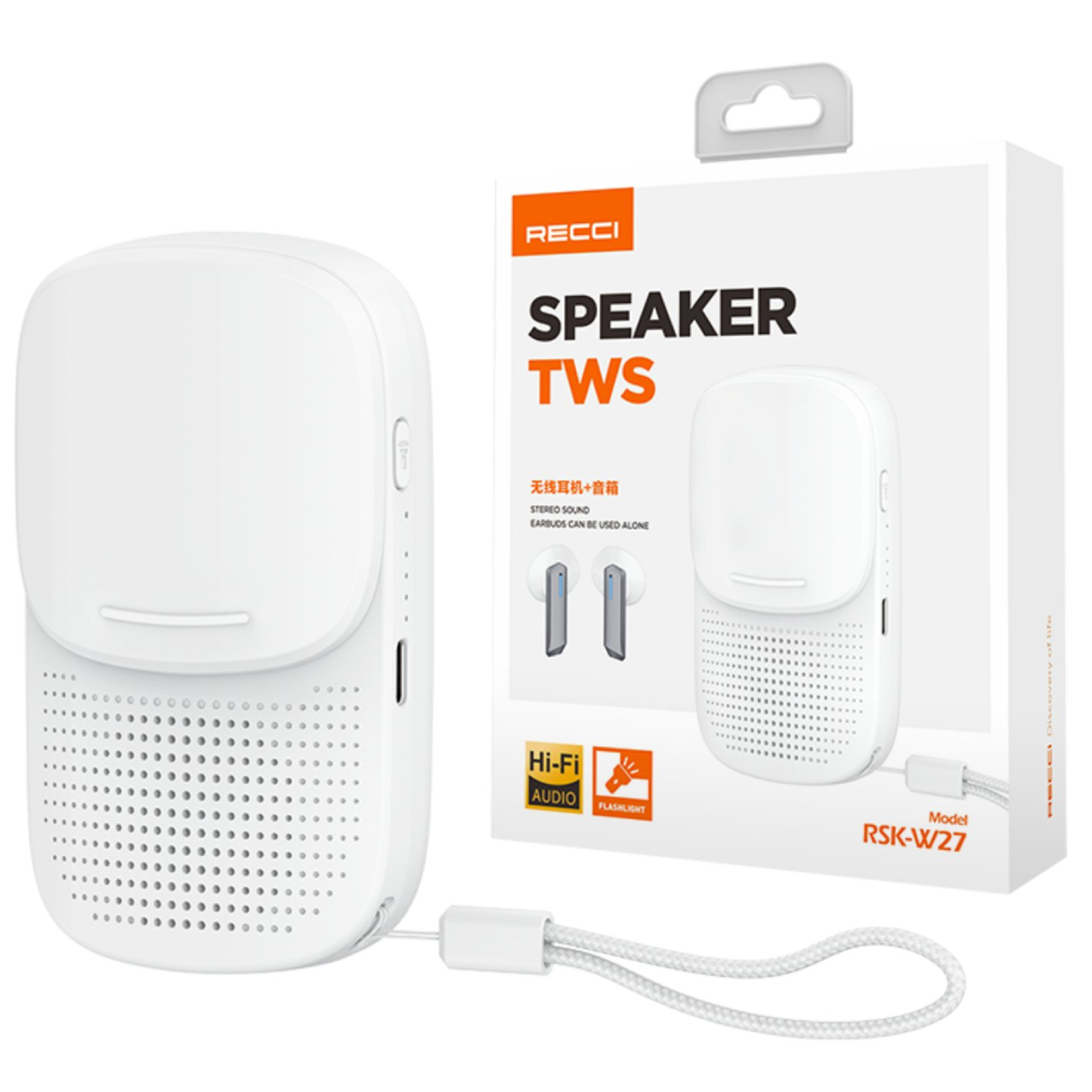 اسپیکر بلوتوثی و هندزفری Recci RSK-W27 یک دستگاه کوچک و قابل حمل است که از پلاستیک فشرده ABS ساخته شده است. درب کشویی در قسمت بالایی آن به عنوان کیس شارژ برای هندزفری عمل میکند. اسپیکر این دستگاه در قسمت پایینی آن قرار دارد که به شکل مشبک طراحی شده است. یک چراغ LED در قسمت فوقانی آن وجود دارد که میتواند به عنوان چراغ قوه در شبهای تاریک مورد استفاده قرار گیرد. در لبه کناری این دستگاه، کلید کنترل چراغ قوه، نشانگرهای LED، درگاه شارژ Type-C و یک بند آویز به طور زیبا طراحی شده است.
