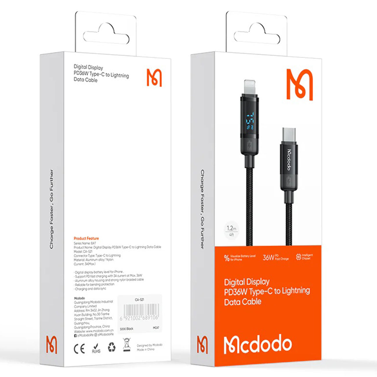 سیم شارژر فست TYPE-C به Lightning مک دودو مدل CA-521 مناسب برای انتقال اطلاعات و شارژ دستگاههای سازگار با پشتیبانی از شارژ سریع و نوع کانکتور لایتنینگ است.