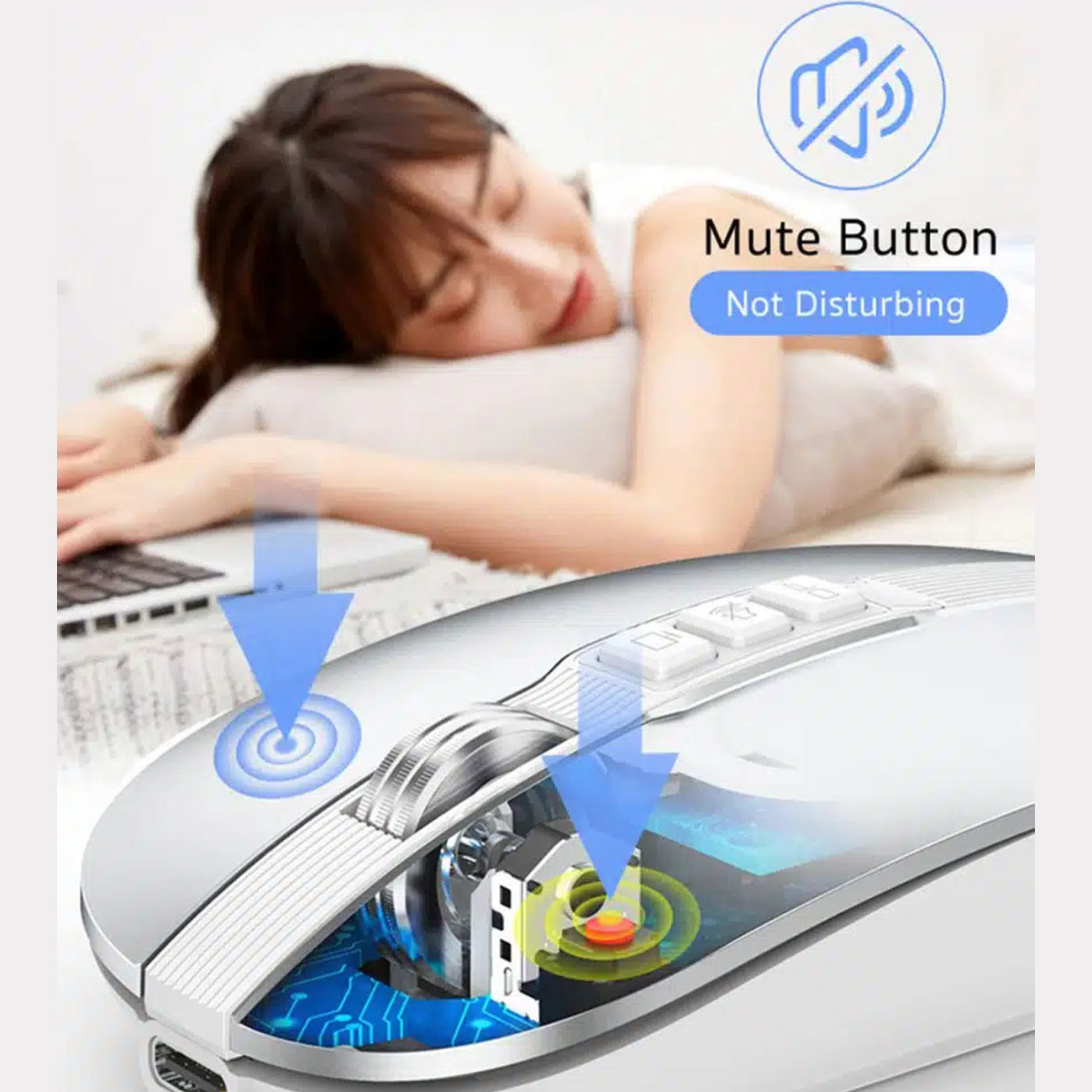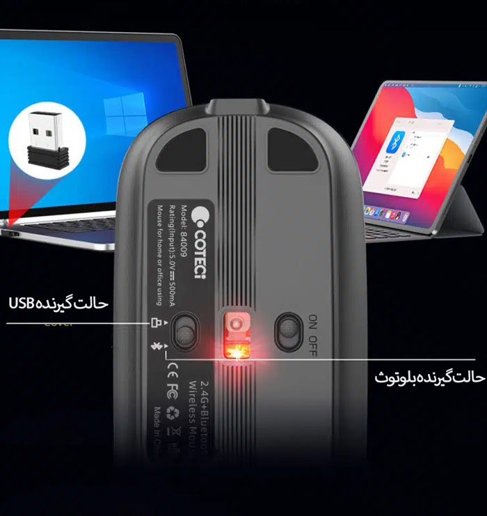 برای این لوازم جانبی لپ تاپ بلوتوث ورژن 5.1 در نظر گرفته شده که قابل اتصال به دو دستگاه هم زمان را فراهم میکند و با یک کلید که در زیر موس قرار دارد میتوانید بین آنها جا به جا شوید؛ پیوند دو حالته BT1 و 2.4G را در اختیار دارید و میتوانید این موس را به سه حالت استفاده کنید که اتصالی بسیار سریع و پایدار را رقم میزند؛ این موس به سه حالت قابل استفاده است؛ هم به صورت اتصال با بلوتوث و هم با استفاده از دانگل؛ برای اتصال با دانگل 2.4G نیز شما میتوانید مانند بسیاری از موس های وایرلس، دانگل مربوط به موس را به یو اس بی کامپیوتر متصل کنید و پس از روشن کردن موس با آن کار کنید.