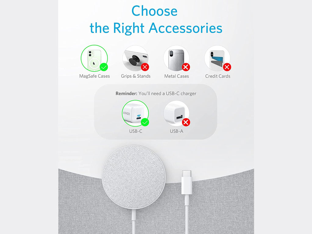 یکی از شارژرهای بسیار جذاب، شارژر بی سیم است که آزادی عمل زیادی را برای کاربران به همراه دارد؛ کمپانی انکر هم در این راستا شارژر وایرلس اپل با کد A2566H11 را طراحی کرده مخصوص سری 12 آیفون است و با قاب مگنتی هم سازگار است.