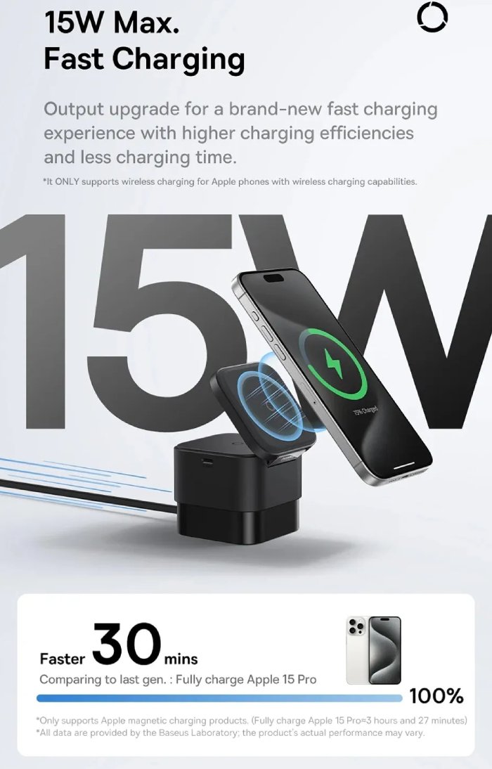 شارژر بیسیم دوکاره بیسوس از قابلیت شارژ سریع با حداکثر توان خروجی 15 وات پشتیبانی میکند. شما میتوانید آیفون 15 پرو رو 30 دقیقه نسبت به شارژرهای نسل قبل، سریعتر شارژ کنید (فول شارژ سریع آیفون 15 پرو تنها در عرض 3 ساعت و 27 دقیقه).