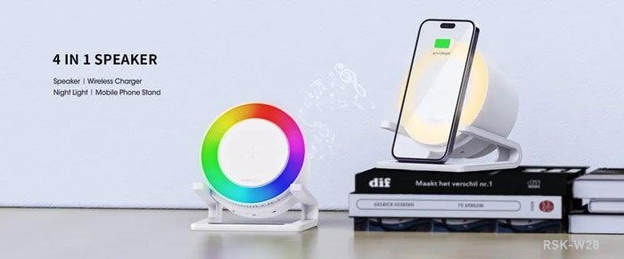 شارژر بی سیم 15 واتی و اسپیکر بلوتوثی رومیزی 4کاره رسی RSK-W28