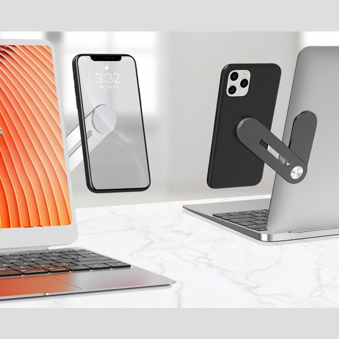 این نگهدارنده موبایل فوقالعاده طراحی مینیمالی دارد و به بدنه لپ تاپ یا مک بوک با چسب بسیار قوی متصل میشود و فضایی از میز را اشغال نمیکند. این چسب با اینکه فوقالعاده قوی است اما بعد از جدا کردن اثری از خود روی بدنه دستگاه باقی نمیگدارد.