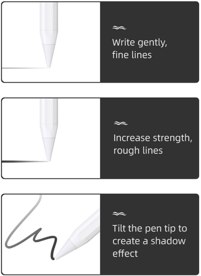 برای انجام طراحیها نیاز است خطوطی ظریف یا ضخیم کشیده شود. کشیدن چنین خطهایی با این قلم بسیار راحت است و بسته به فشاری که به نوک قلم وارد میشود به آسانی خطوط مورد نیازتان روی صفحه طراحی خواهد شد. یعنی برای کشیدن خطوطی ظریف نیازی به هیچ فشاری نیست و برای طرح خطوط ضخیم و ناهموار کافیست مقداری فشار به نوک وارد شود. بعلاوه برای ایجاد یک افکت سایه کافیست نوک خودکار آیپد را کمی کج کنید.