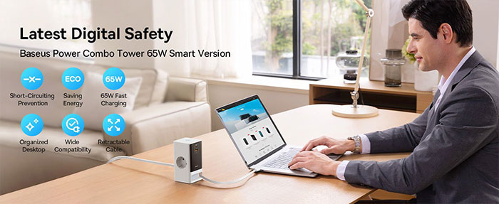 سیم سیار بیسوس PowerCombo برای با 1 پورت USB-A و 1 پورت USB-C،و دو خروجی AC می توانید 5 دستگاه را به طور همزمان شارژ کنید. یک کابل شارژ سریع 65 واتی تایپ سی نیز به این چندراهی متصل است داخل بدنه آن جای دهی می شود. این چندراهی در حین ارائه یک میز سازمان یافته، هزینه ها را نیز کاهش می دهد.