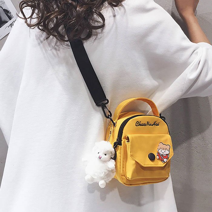 کیف دوشی جذاب با طراحی رنگی و زیبا این امکان را به شما میدهد تا به راحتی استایل های رنگی متفاوت داشته باشید. استفاده از رنگ های متنوع زیبایی آن را دو چندان کرده . همچنین استفاده از یک طرح برجسته دختر بچه روی جیب کوچک کیف ظاهری متفاوت به آن داده است.