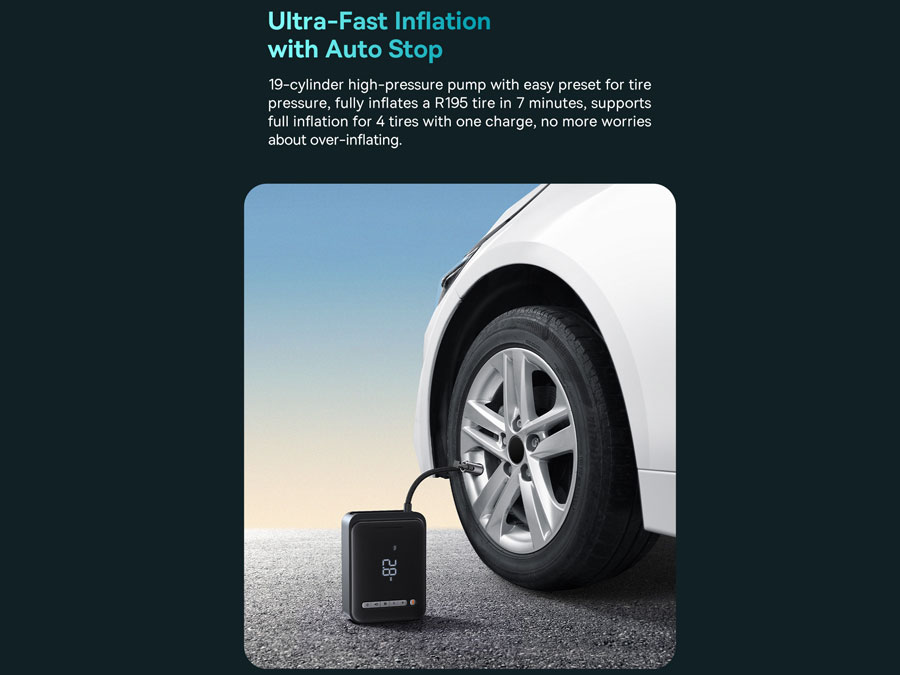 این دستگاه با یک بار شارژ قابلیت شارژ چهار لاستیک را دارد و در مدت هفت دقیقه قادر به باد کردن لاستیک R195 خواهد بود.
