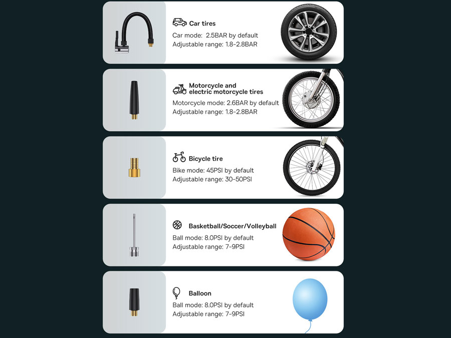 به یک سیلندر فشار قوی 12 ولت مجهز است و عملکردی قدرتمد و پایدار دارد. به راحتی میتوانید لاستیک انواع خودرو، موتور سیکلت، دوچرخه را باد کنید؛ همچنین برای باد کردن توپ و بادکنک هم قابل استفاده است. باد کردن هر کدام از آنها با تعداد سری مخصوص انجام میشود.