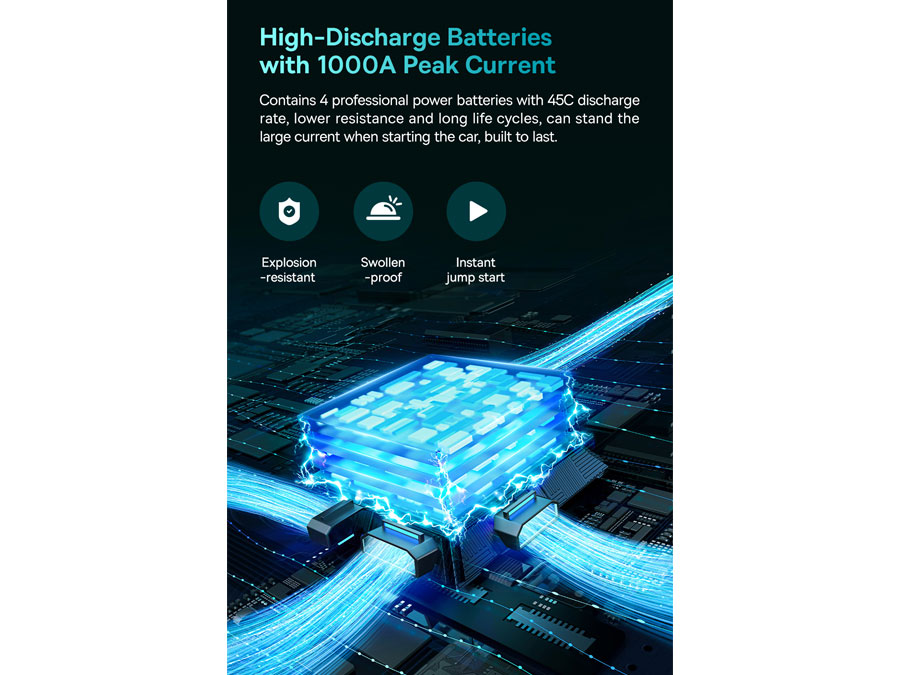 درون جامپ استارتر super energy بیسوس چهار باتری قدرتمند با نرخ تخلیه 45 درجه سانتیگراد و حداکثر جریان 1000 آمپر گنجانده شده؛ این باتریها از کارایی بالایی برخوردارند و در عرض چند ثانیه خودرو را روشن میکنند. قابلیت تحمل دمایی آنها از -10 درجه تا 60 درجه سانتیگراد است و قابلیت استفاده در فصل سرد یا گرم برایتان امکانپذیر خواهد بود.