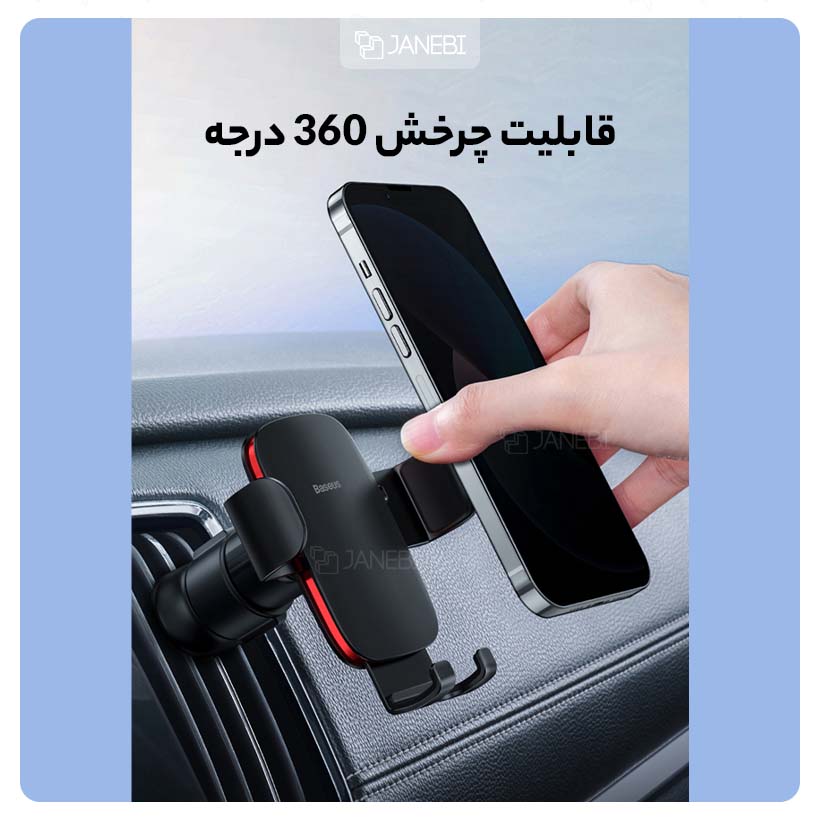 طراحی این محصول بیسوس برای نصب در دریچه خودرو بوده و با استفاده از گیرهای که دارد به راحتی در دریچه هوای خودرو نصب میشود. سه بازوی در اطراف آن قرار گرفته و با ایجاد حالتی مثلثی شکل گوشی را کاملا محکم در خود نگه میدارد و مانع افتادن آن میشود. در ضمن با توجه به نیروی گرانشی که از آن برخوردار است با کمک یک دست میتوانید به راحتی موبایل خود را درون آن قرار دهید. از قابلیت چرخش 360 درجه برخوردار بوده و شما با توجه به نیازتان میتوانید زاویه دید مناسب خود را تنظیم کنید.