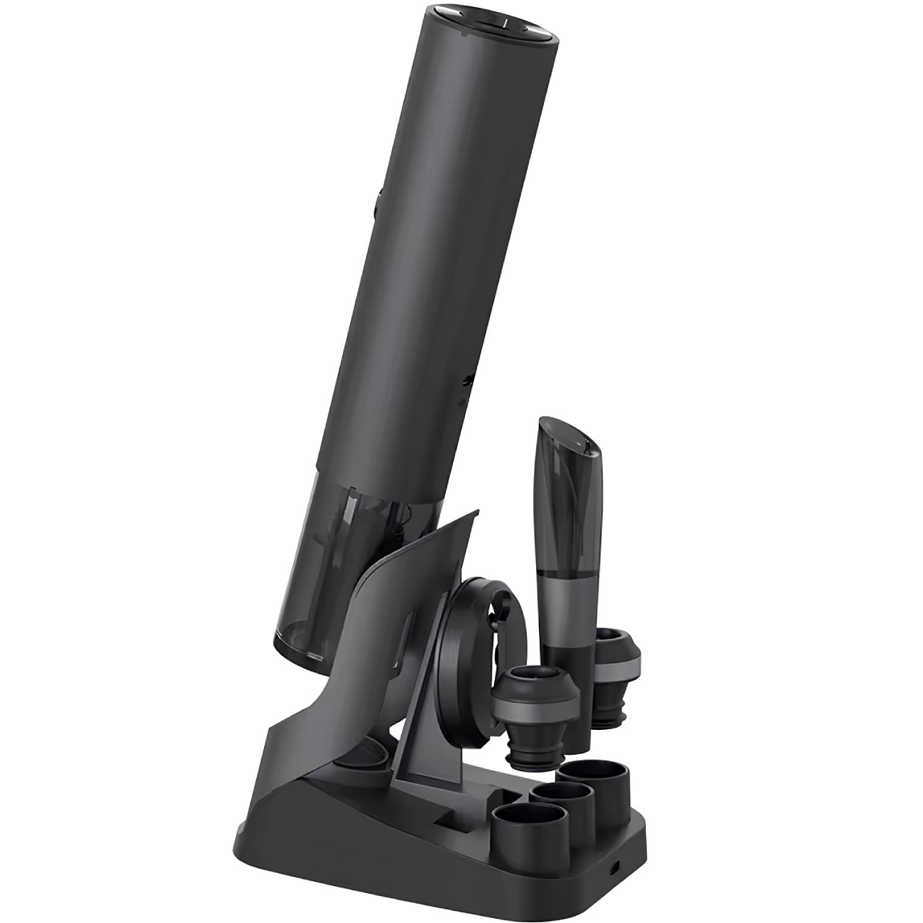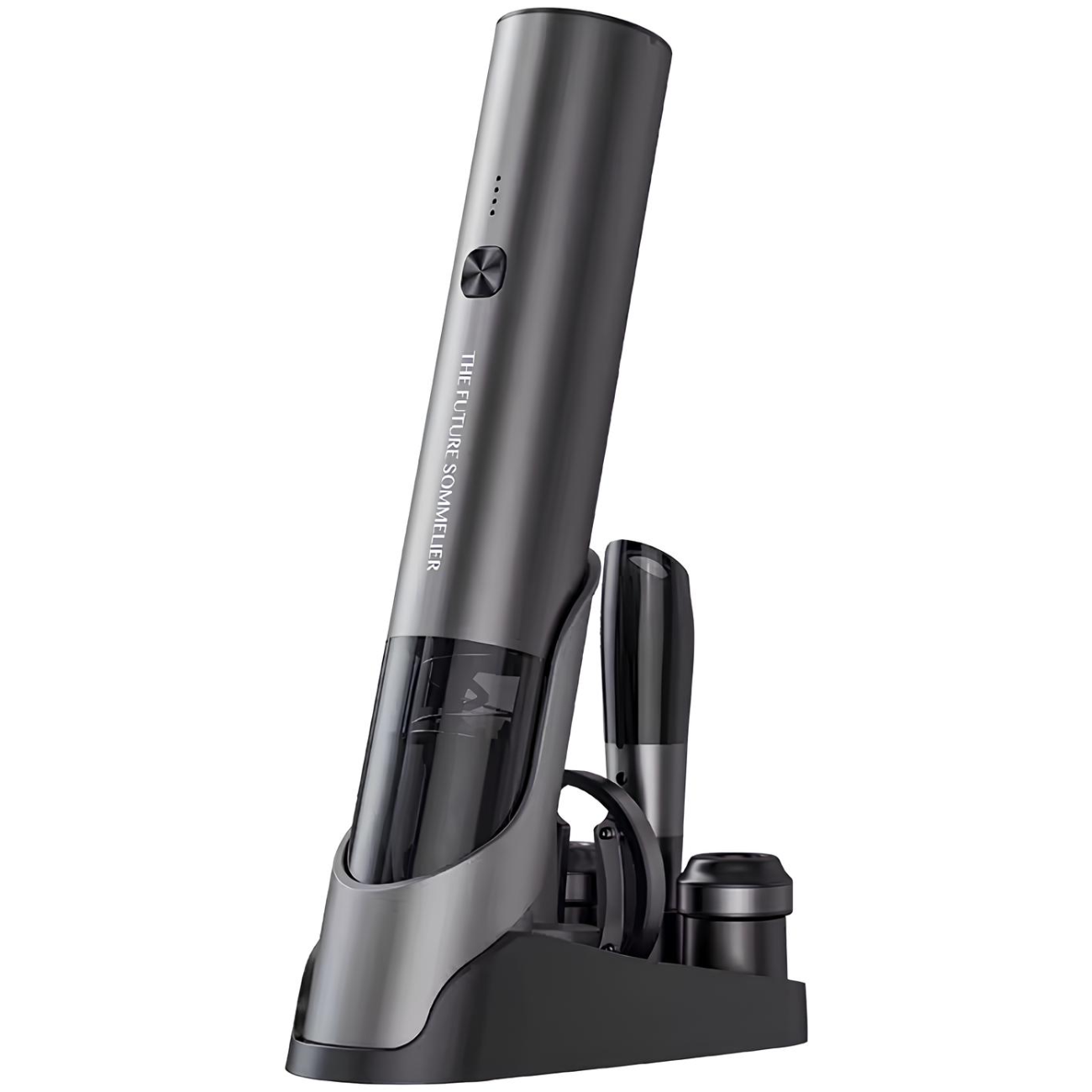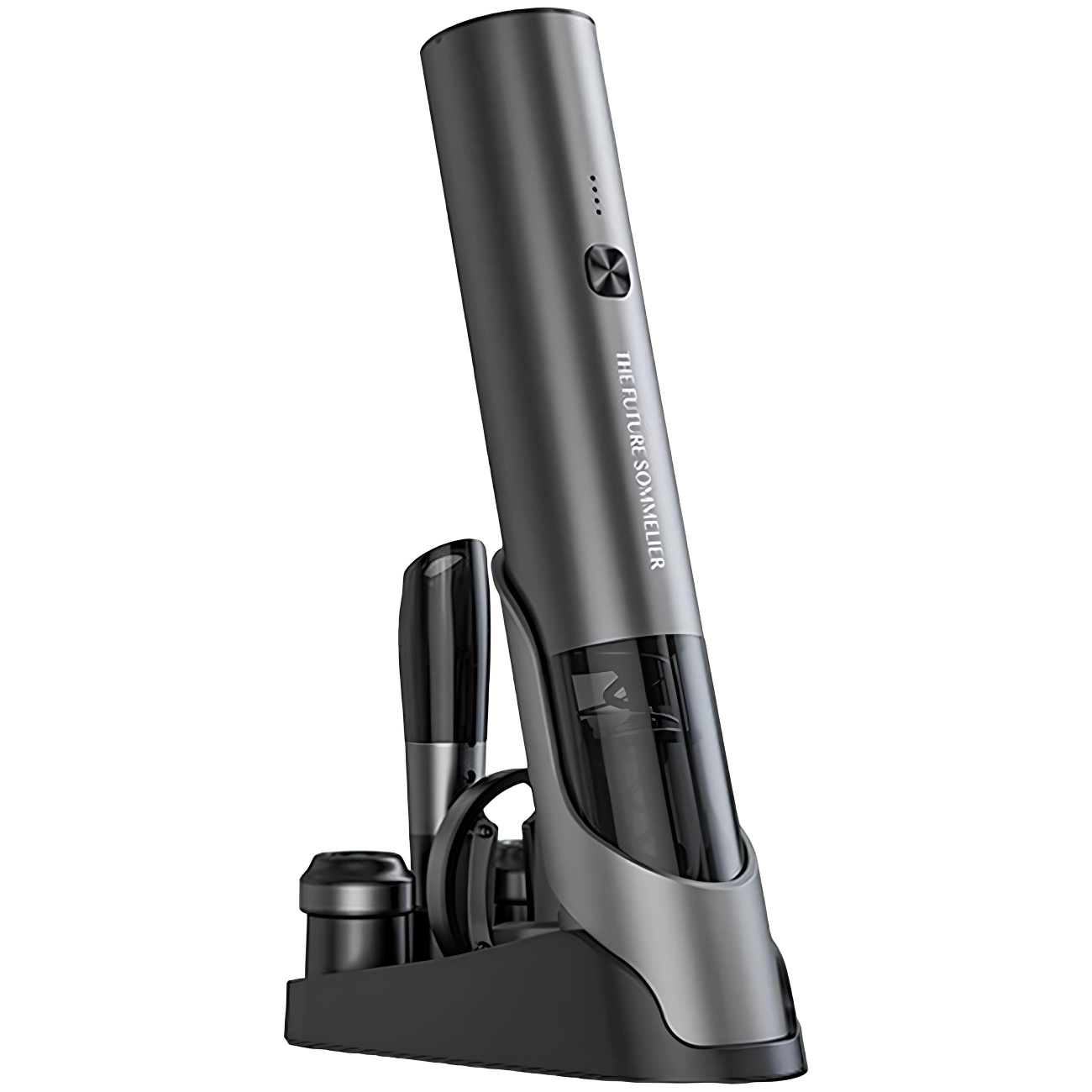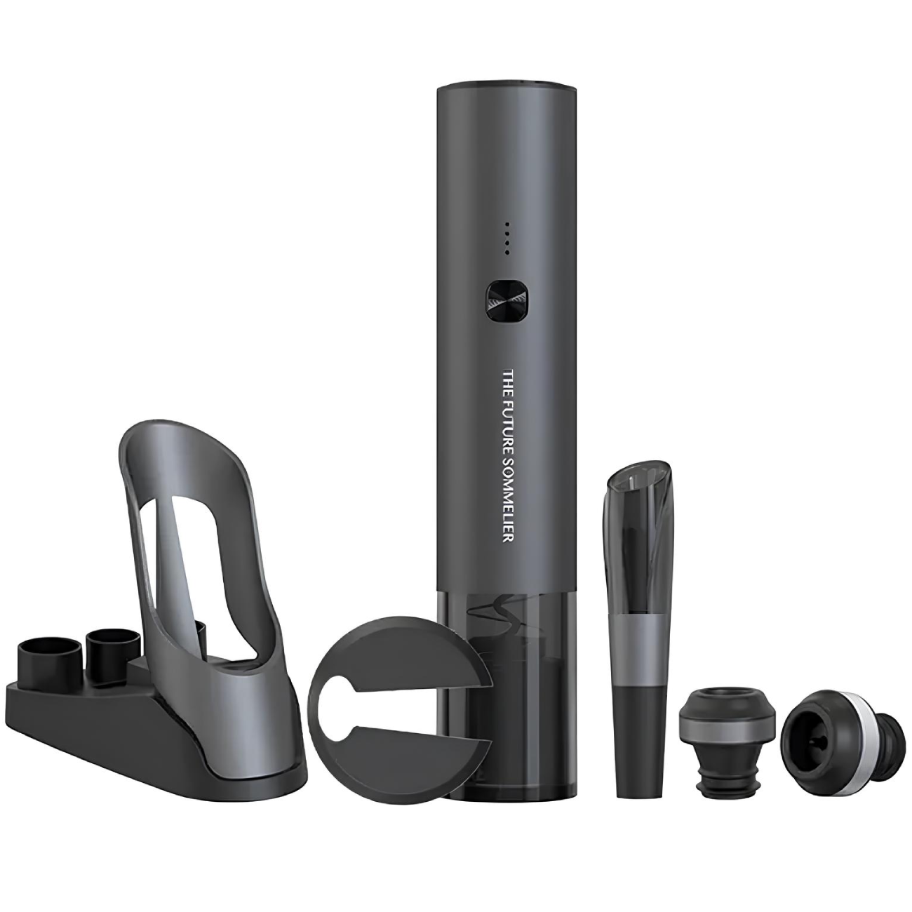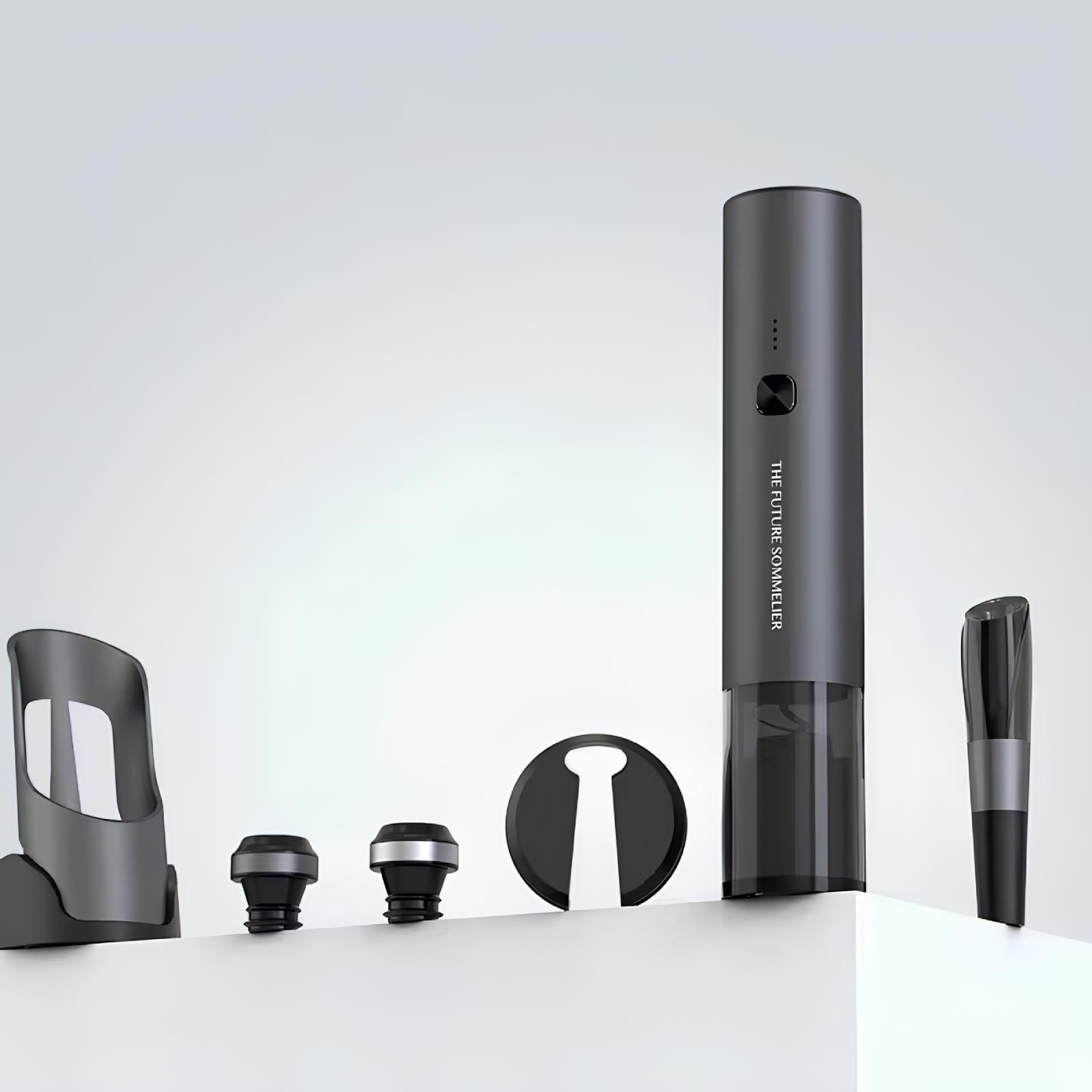 | محتوای بسته | درب بطری بازکن شارژی، چاقوی برش فویل، 2 درپوش نگهدارنده، ظرف هوادهی، پایه شارژ، کابل شارژ Type-C و دفترچه راهنمای محصول |