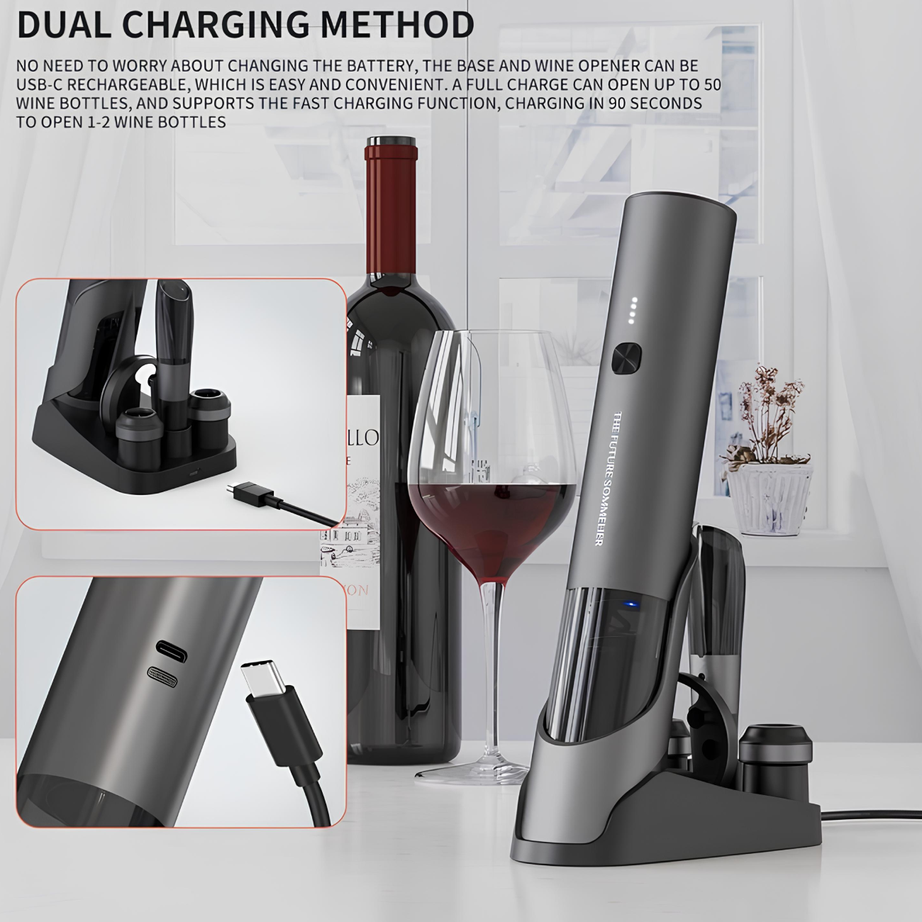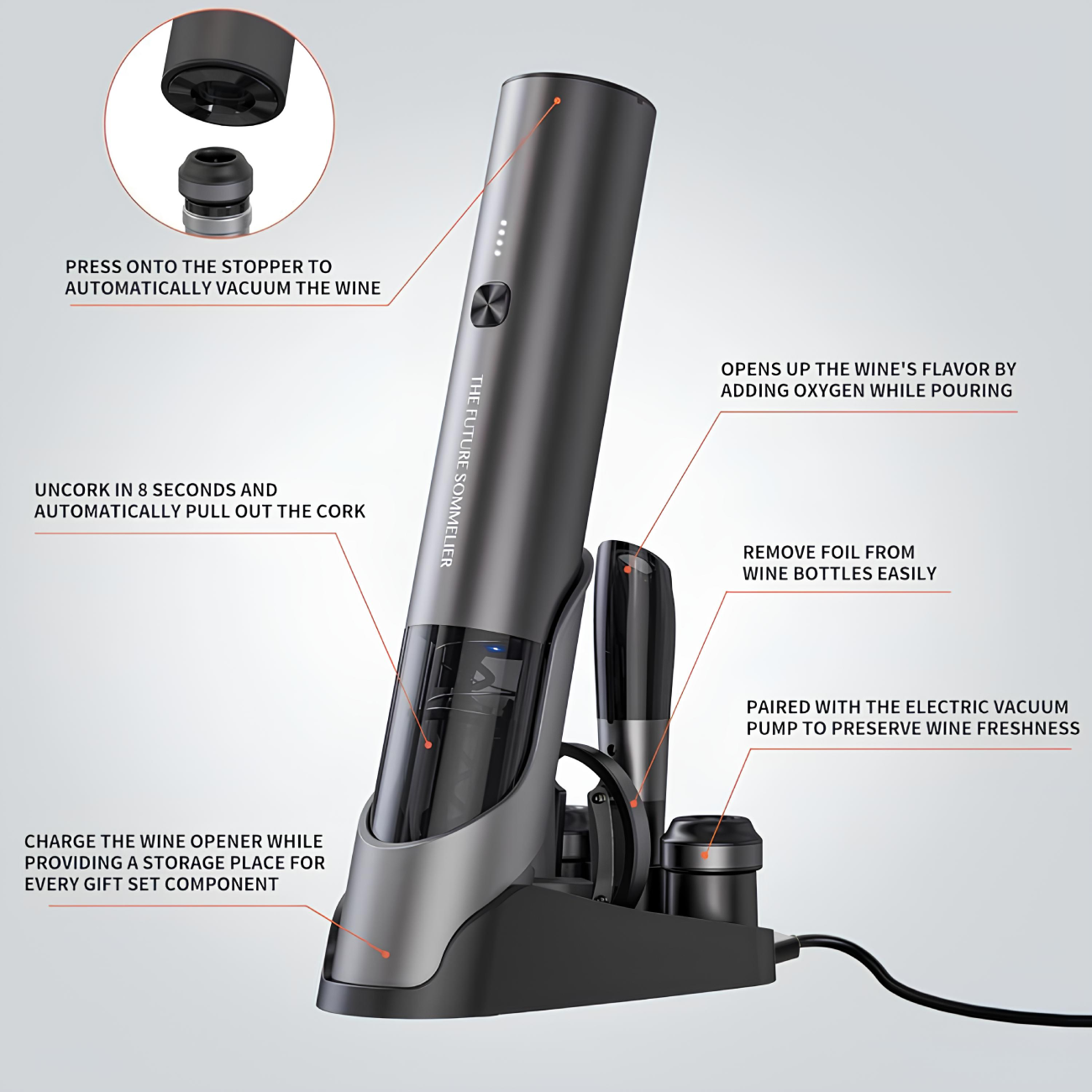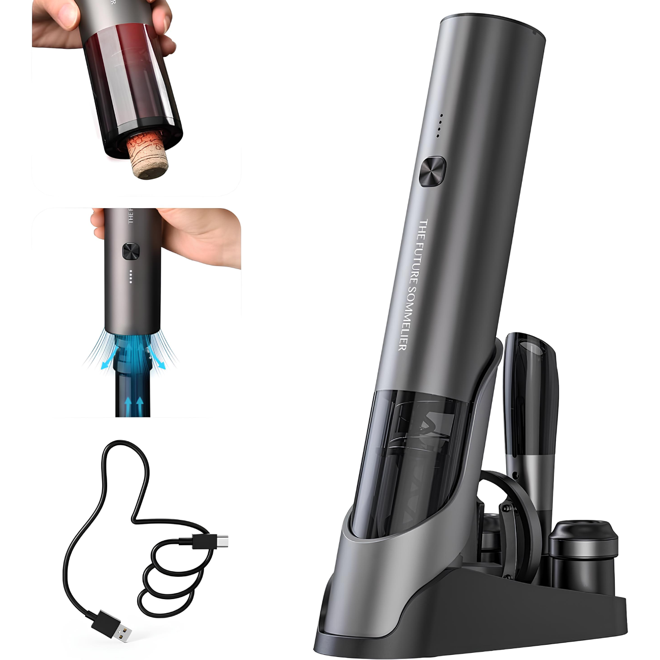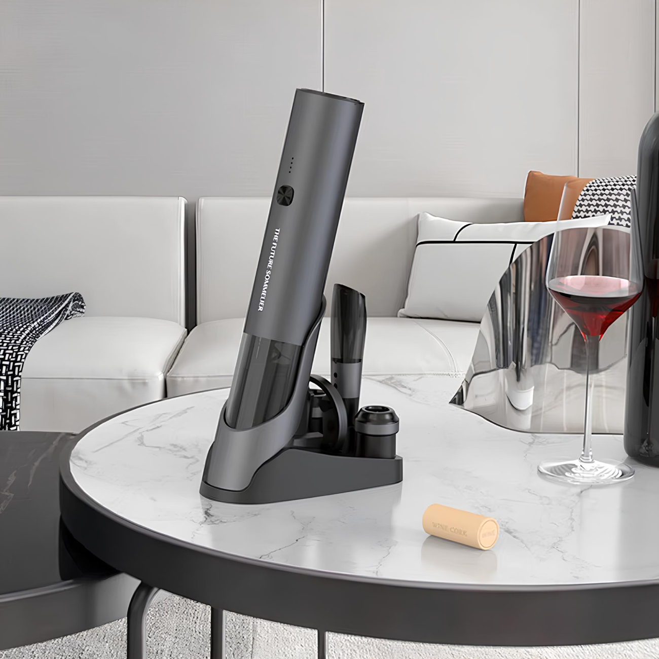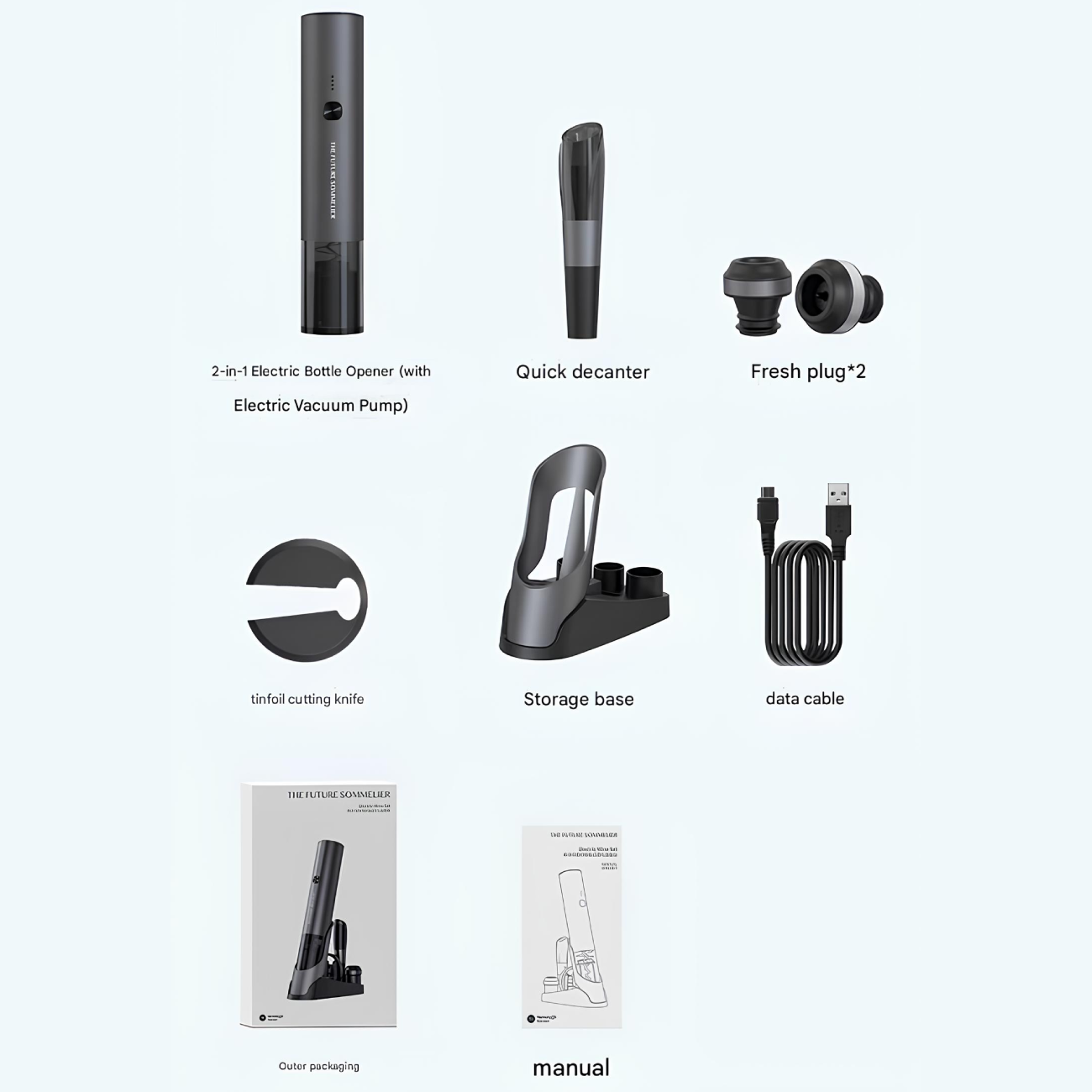 | محتوای بسته | درب بطری بازکن شارژی، چاقوی برش فویل، 2 درپوش نگهدارنده، ظرف هوادهی، پایه شارژ، کابل شارژ Type-C و دفترچه راهنمای محصول |