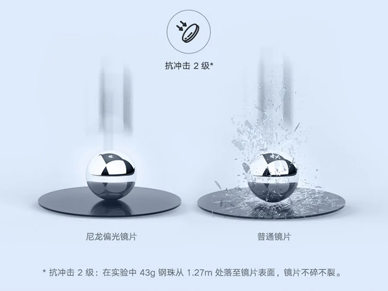نکته مثبت دیگری که باید به آن اشاره کرد این است که لنزهای نایلونی که شیائومی استفاده میکند مقاومت بسیار خوبی در برابر ضربه دارند، سطح ایمنی با سطح مقاومت در برابر ضربه سطح 2 ارتقا یافته است. طبق آزمایشات این شرکت، یک شیشه توپ فولادی 43g از ارتفاع 1.27 متری روی سطح لنز می افتد و نتیجه نهایی این است که لنز نمیشکند!
