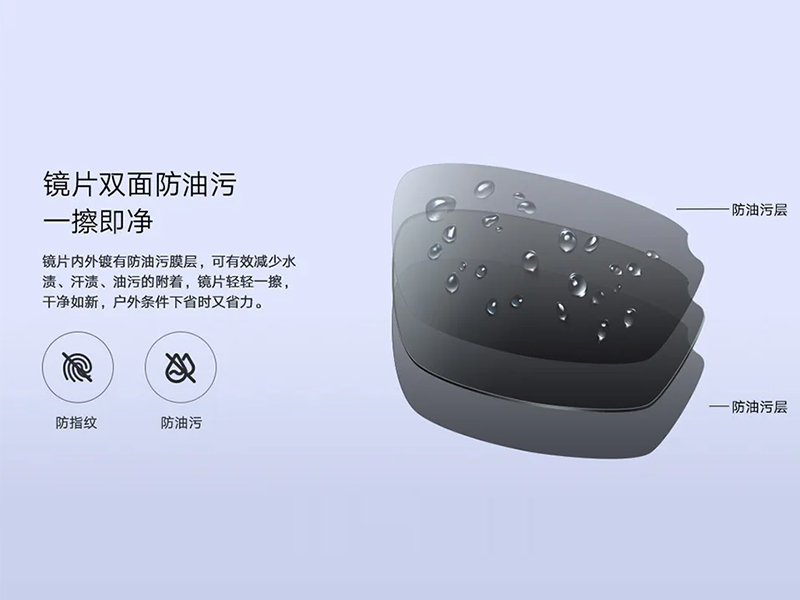 دو طرف لنز عینک شیائومی در برابر روغن مقاوم است و تنها با یک دستمال مرطوب به سرعت تمیز میشود. به دلیل پوشانده شدن با یک فیلم ضد روغن، چسبندگی لکههای آب، عرق و اثر انگشت را به طور موثر کاهش میدهد. بنابراین تمیز کردن آن آسان است و باعث صرفه جویی در زمان و تلاش در تمیز کردن عینک در هنگام استفاده در خارج از منزل میشود.