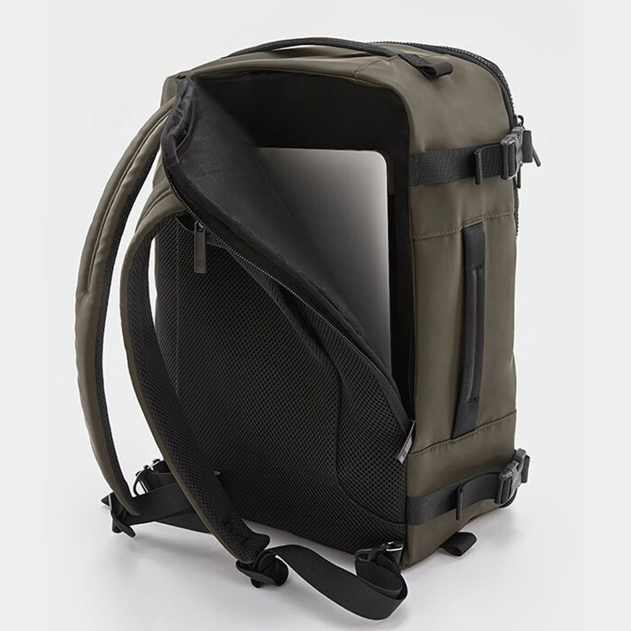 در قسمت پشت کوله پشتی شیائومی یک کمربند تعبیه شده است که با آن می توانید کوله پشتی را به طور ایمن روی دسته جمع شونده یک چمدان چرخدار قرار دهید. این کار حمل و نقل آن را بسیار آسان تر می کند.