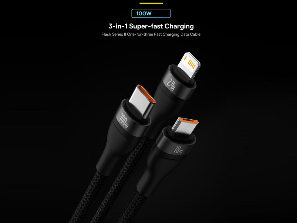 کابلهای فست شارژ زیادی توسط کمپانیهای مختلف طراحی و تولید شدهاند اما این بار کمپانی بیسوس با طراحی هوشمندانه خود کابل شارژی را در اختیار کاربراش قرار داده که بسیار کاربردی است. نام این محصول کابل سوپر فست شارژ سه سر یو اس بی به میکرو، تایپ سی و لایتنینگ 1.2 متر بیسوس Baseus Flash Series Ⅱ Cable USB to M+L+C 100W است.