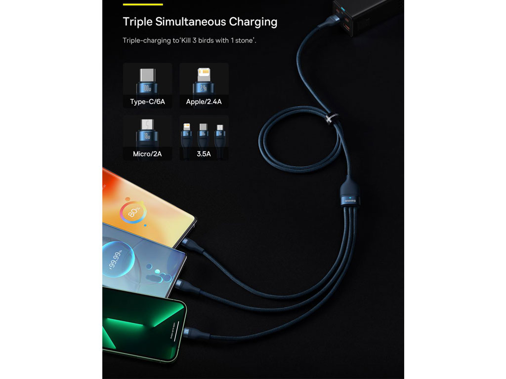 با وجود کابل سه سر بیسوس دیگر نیازی به تهیه انواع کابلهای شارژ با کانکتورهای متفاوت نخواهید داشت. این کابل از کانکتورهای تایپسی، میکرو و لایتنینگ تشکیل شده و قابل استفاده برای برندهای آیفون، شیائومی، سامسونگ، هوآوی و ... خواهد بود و میتوانید به صورت همزمان به شارژ سه دستگاه بپردازید.