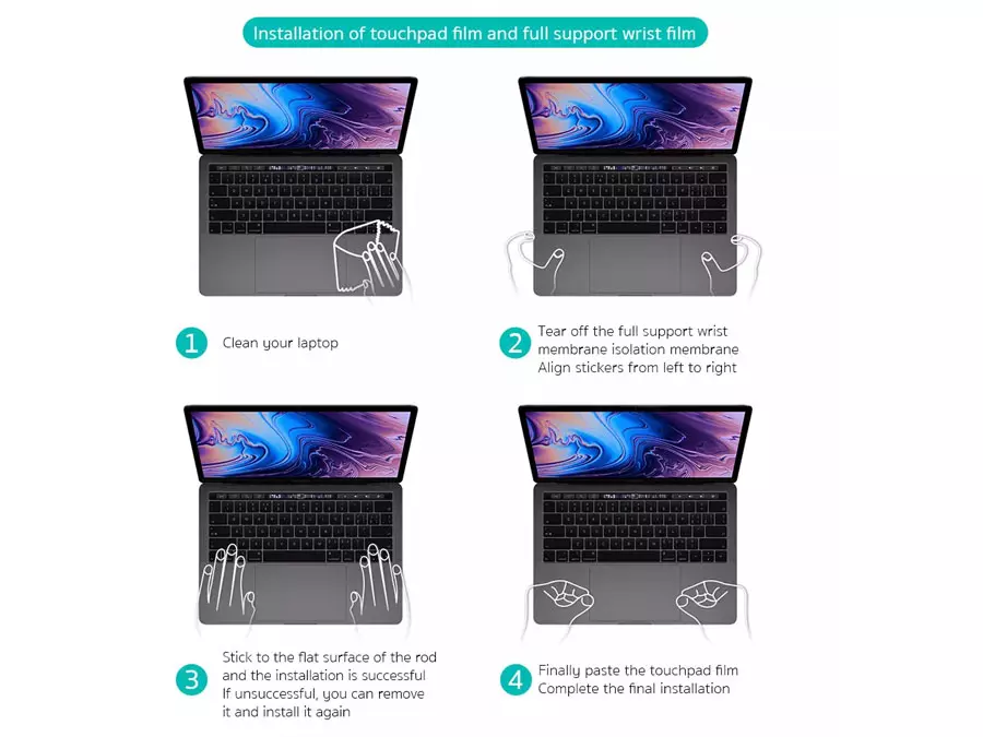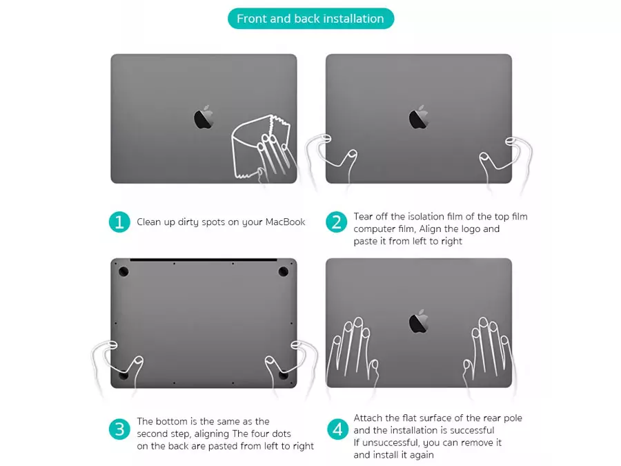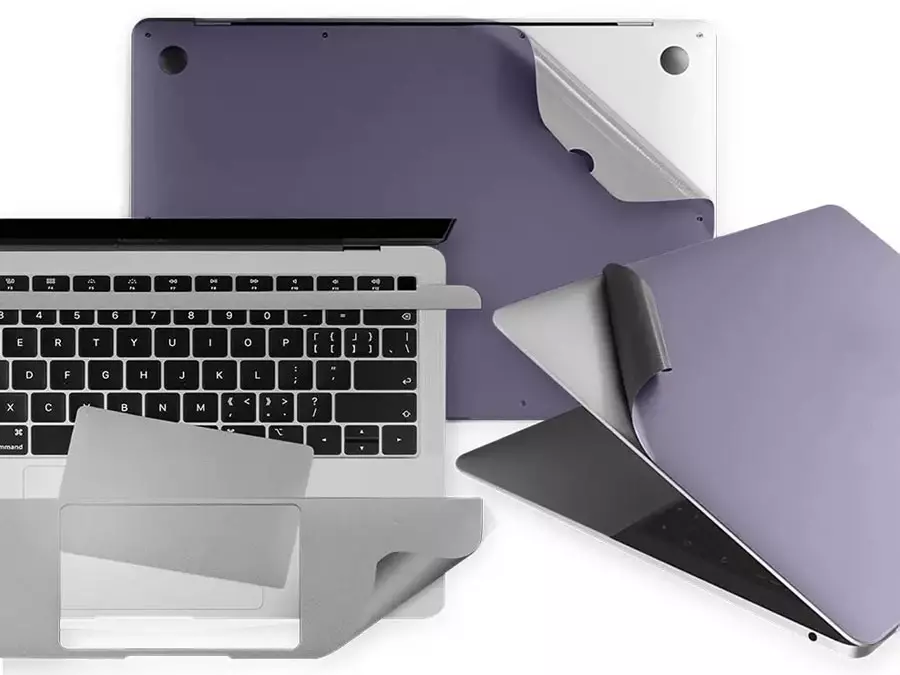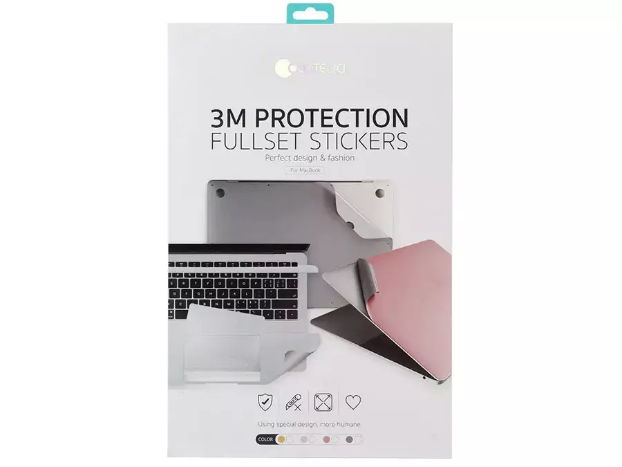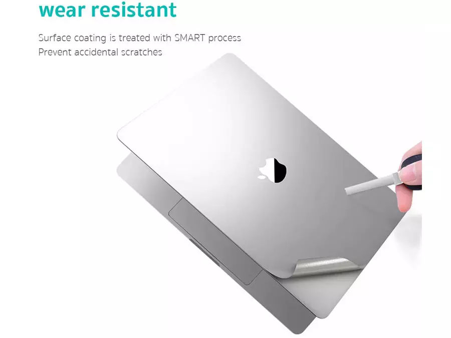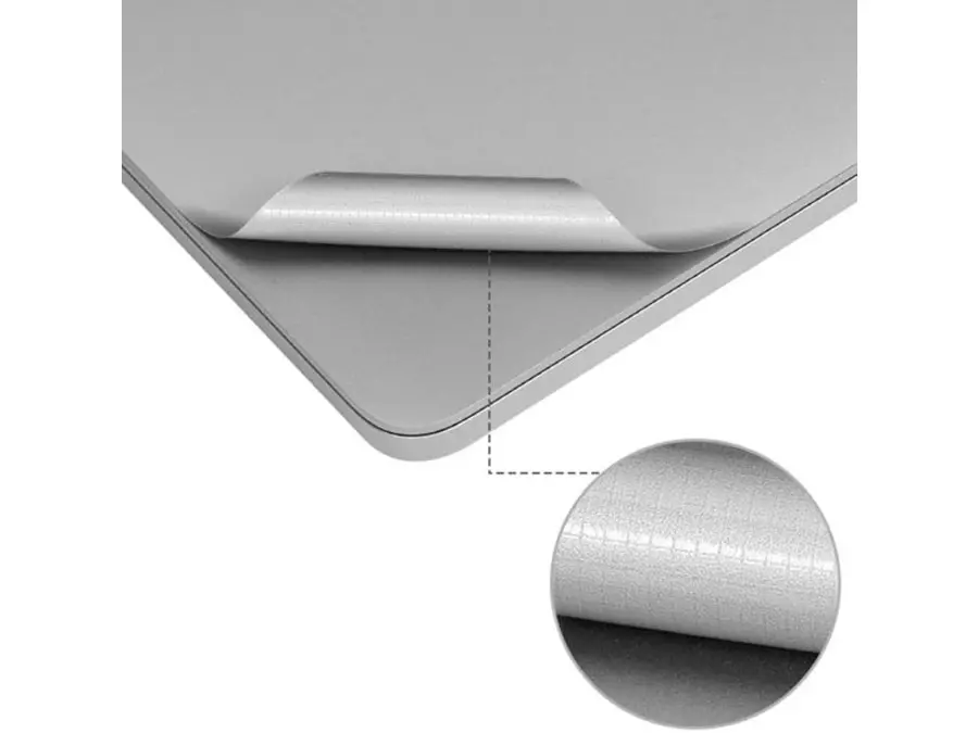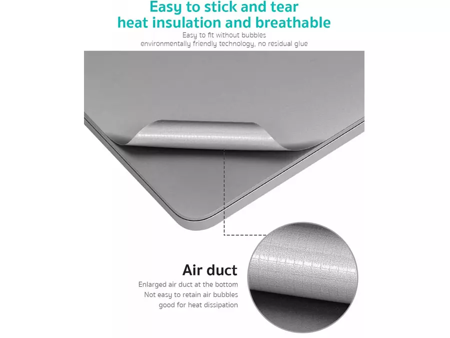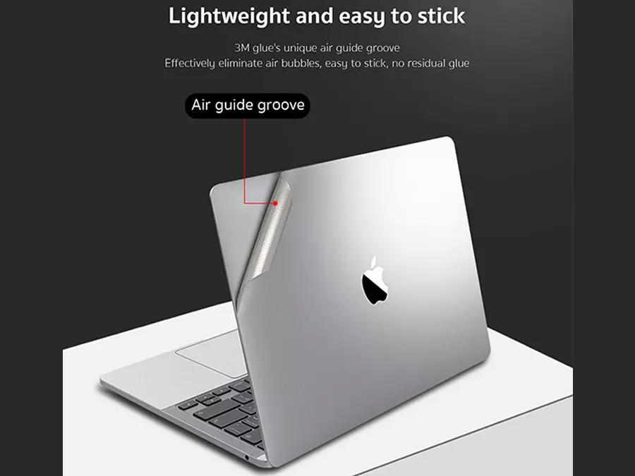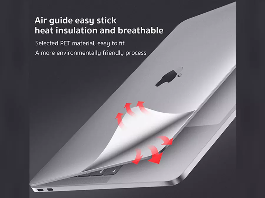 در ساختار آن از مواد پلی اتیلنترفتالات یا به اختصارPET استفاده شده و بسیار مرغوب است و مقاومت بالایی در برابر حرارت دارد. در بخش داخلی آن از چسب 3M استفاده شده و در صورت جدا کردن آن، هیچگونه آثاری از آن روی بدنه باقی نمیماند و آسیبی هم به بدنه وارد نمیکند. همچنین در این قسمت شیار حرارت و تنفس طراحی شده که مانع ایجاد حباب میشود و گرما را هم به خوبی دفع میکند. این محافظ، نقره ای رنگ است و کاملا با بدنه مک بوک مطابقت دارد.
