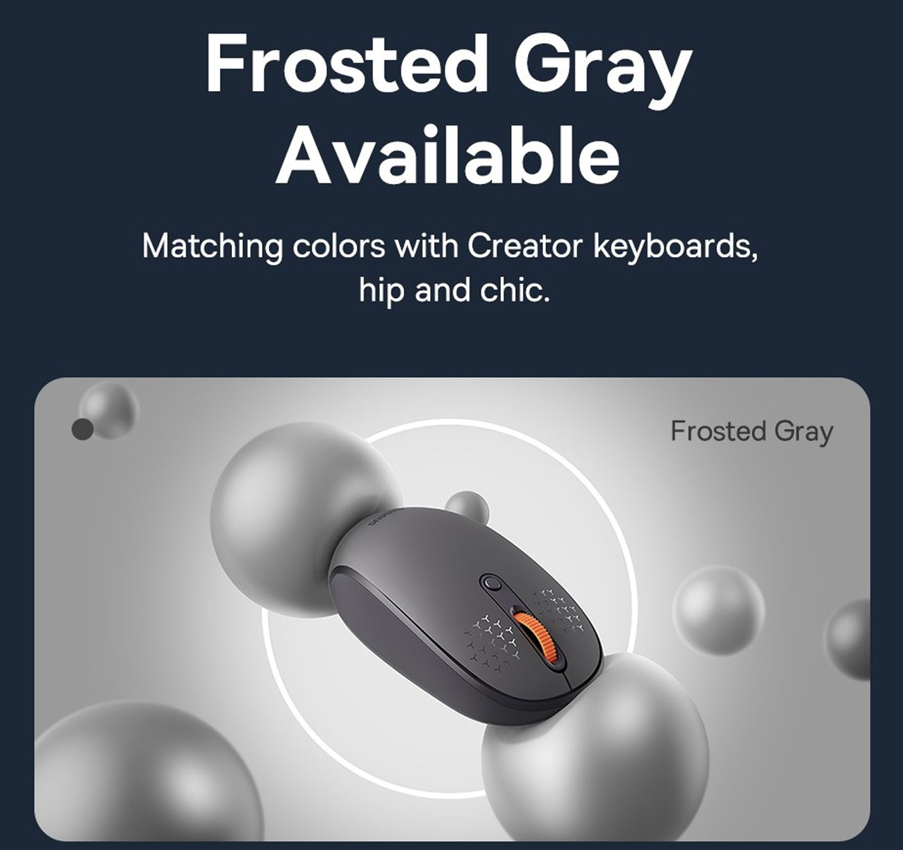موس وایرلس بیسوس F01B B01055502833 از از پلاستیک ABS در رنگ خاکستری ساخته شده است. اندازه این ماوس 38.5×58.1×100.35 میلیمتر است که ماوس نسبتا کوچکی است. وزن ماوس 90 گرم است، به گونهای طراحی شده است تا بتوانید از آن برای کارهای گرافیکی ، کارهای روزمره و عمومی استفاده نمایید.