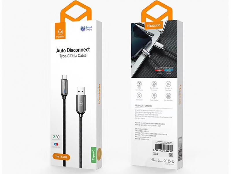 کابل شارژ 1 متری تایپ سی مک دودو MCDODO CA-619 از پروتکل شارژ سریع QC 4.0 پشتیبانی کرده و قادر است در 30 دقیقه، 90 درصد ظرفیت باتری را شارژ کند. حداکثر جریان قابل انتقال از این کابل، 3 آمپر می باشد.