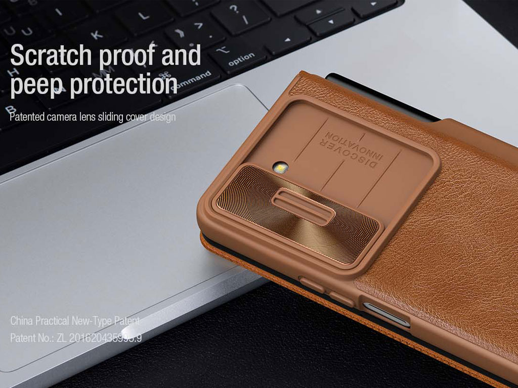 لنز دوربین گوشی و تبلت هم مانند صفحه نمایش آنها بخش حساسی است و با وارد آمدن ضربه آسیب میبیند؛ در این گارد کلاسوری گوشی زد فولد 5 نیلکین پوششی کشویی برای این بخش تعبیه شده که با بستن آن از رسیدن آسیب یا ورود گردوغبار به این قسمت جلوگیری خواهد شد. در ضمن اطراف این بخش قاب دارای برجستگی بوده و وقتی پنجره کشویی باز است و گوشی را روی سطح قرار میدهید خطوخشی روی آن ایجاد نخواهد شد.