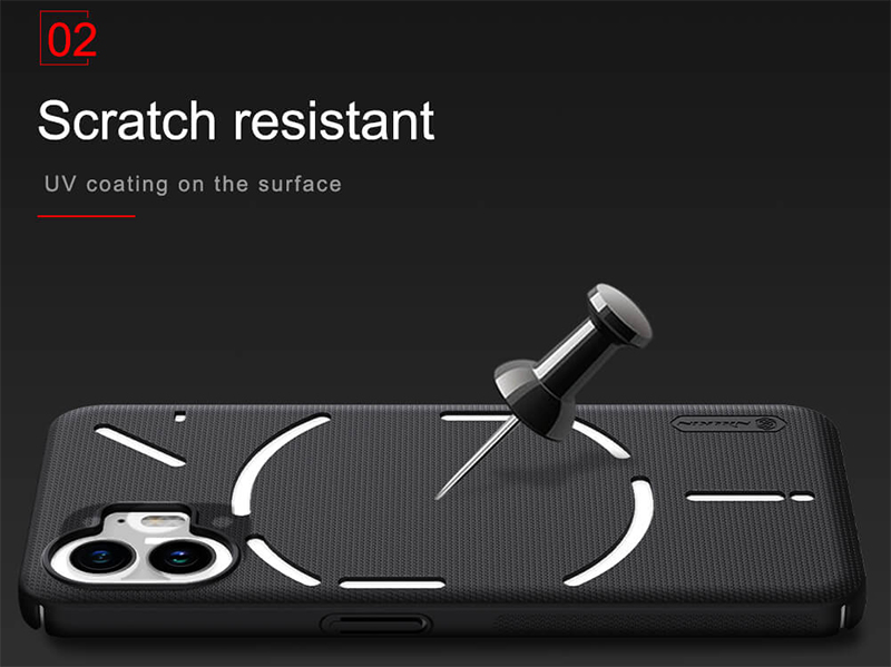 کاور ناتینگ فون 2 برند نیلکین از پلاستیک سخت (PC) با پوشش ویژهی UV دوطرفه ساخته شده است. به همین دلیل هم ضدضربه است و هم دربرابر شکستگی، خوردگی، خراشیدگی و خط وخش مقاومت بالایی دارد.