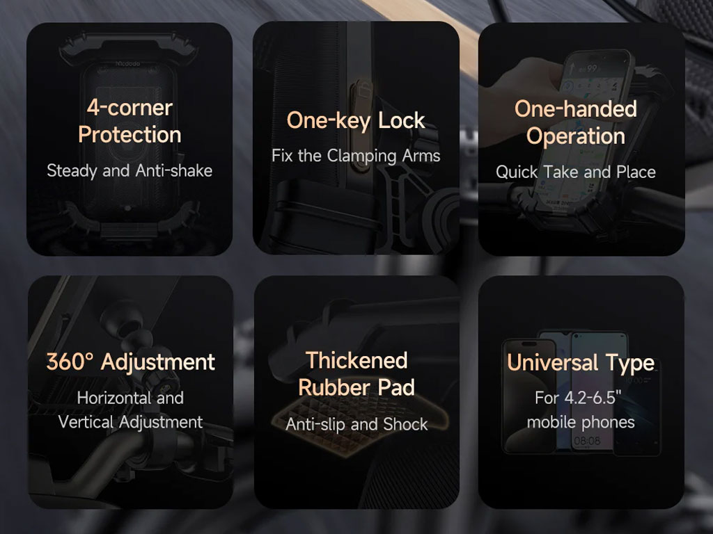 نگهدارنده موبایل موتور سیکلت و دوچرخه برند مک دودو Mcdodo CM-524 روی بسیاری از موتورسیکلتها و دوچرخهها قابل نصب بوده و میتوان گوشیهای موبایل تا سایز ۶.۷ اینچ را بر روی آنها نصب و مورد استفاده قرار داد.