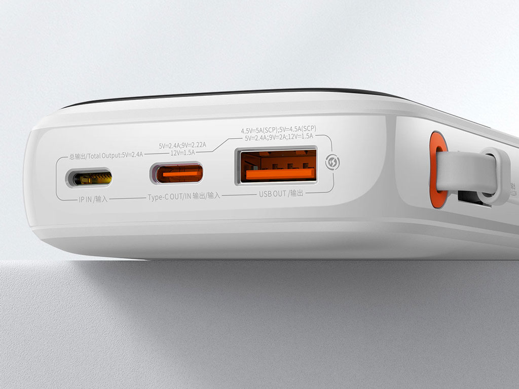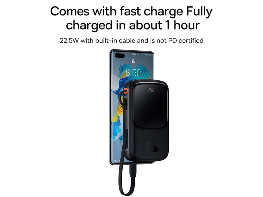 - درگاه USB خروجی: 4.5V/5A (SCP) | 5V/4.5A (SCP) | 5V/3A | 9V/2A | 12V/1.5A توان 22.5 وات (50 درصد شارژ میت 40 در نیم ساعت)