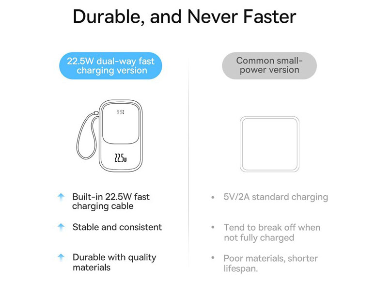باتری پاوربانک بیسوس از نوع لیتیوم یون پلیمر بوده و از ظرفیت اسمی 10000 میلیآمپرساعت برخوردار بوده اما بازدهی واقعی آن 5800 میلیآمپرساعت است. روی بدنه آن دو پورت خروجی یواسبی و یک پورت دوطرفه تایپسی قرار دارد. کابل متصل 0.5 متری هم با کانکتور تایپسی آخرین خروجی آن به شمار میرود.