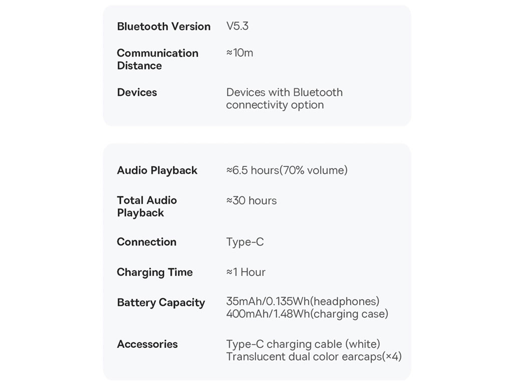 برای شارژ شدن هندزفری نیاز نیست مدت زمان طولانی منتظر بمانید؛ باتری 400 میلیآمپرساعتی آن با استفاده از درگاه Type-C و کابل شارژی که درون بستهبندی موجود است حدود یک ساعت زمان لازم دارد تا فول شارژ شود. پس از شارژ کامل هم تا 30 ساعت شارژدهی گوشیها را جوابگو خواهد بود. هر کدام از ایربادها هم 35 میلیآمپرساعت ظرفیت دارند و تقریباً 6.5 ساعت (با صدای 70 درصد) برای پخش موسیقی را در اختیار خواهید داشت.