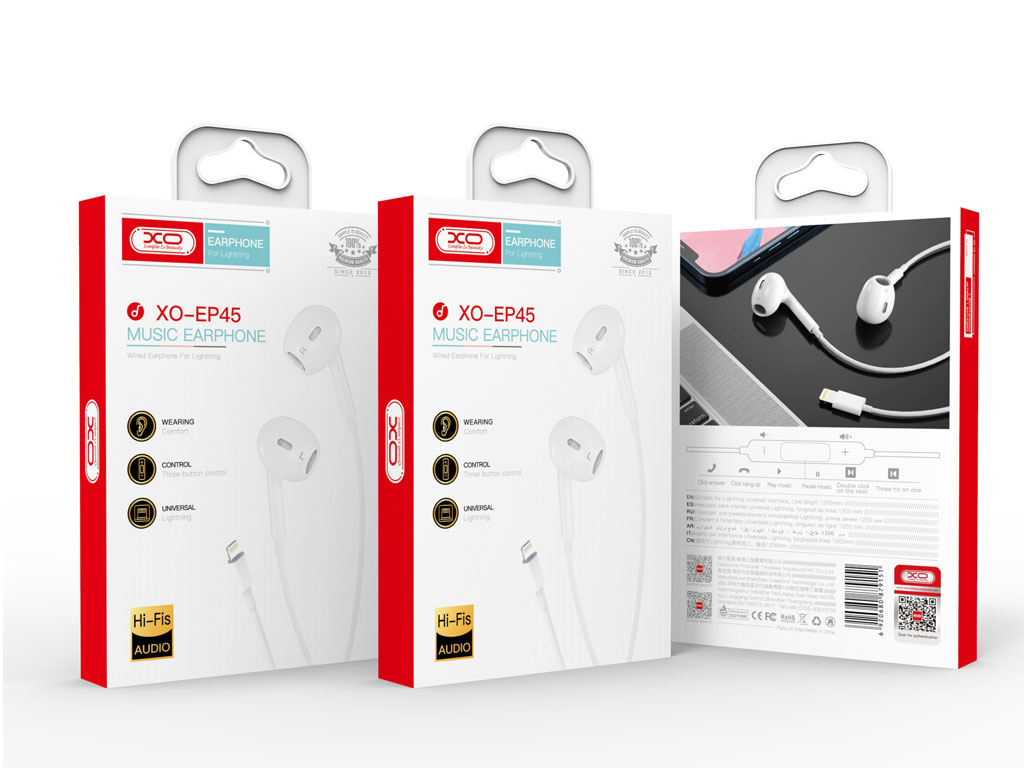 کمپانی ایکساو هم که شرکتی فعال در تولید لوازم جانبی موبایل است لیست تولیدات خود را گسترش داده و انواع هندزفری را به آن اضافه کرده است. نمونهای از این هدفون با عنوان هندزفری سیمی لایتنینگ ایکساو XO EP45 Lightning In-ear Earphones توسط این شرکت طراحی و به تولید رسیده و در اختیار کاربرانش قرار گرفته است.