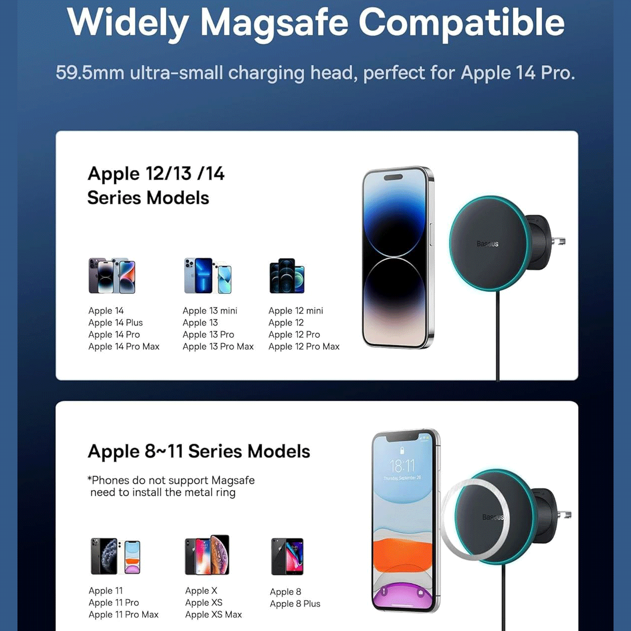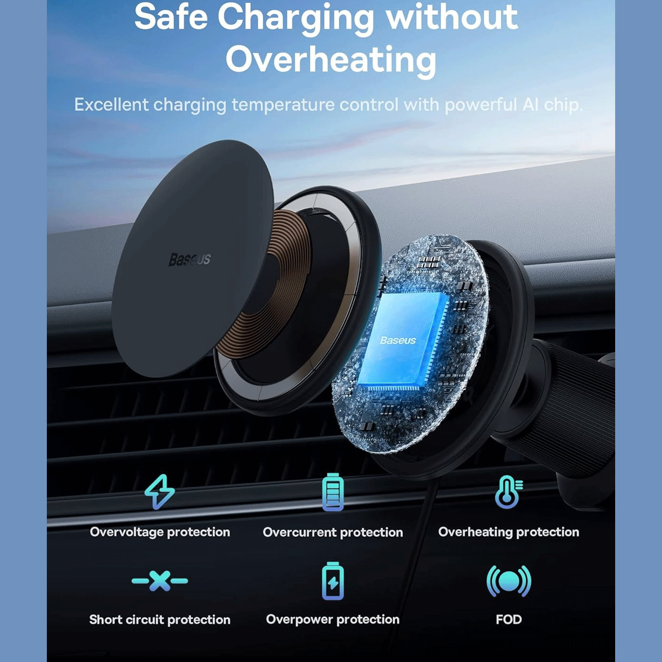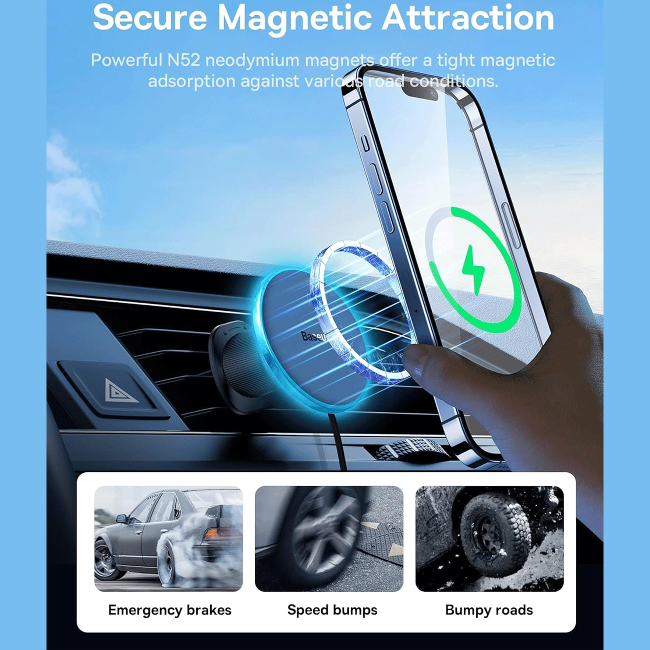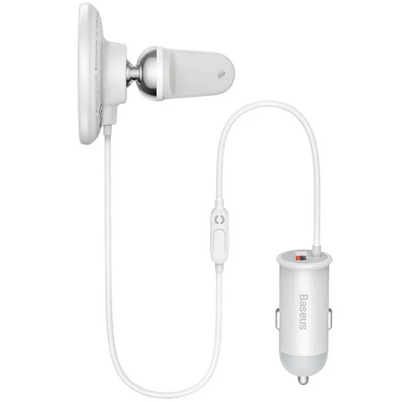 شارژر فندکی بیسوس دارای یک هولدر موبایل نیز هست که به وسیله ی گیره به دریچه کولر متصل میشود و در جاده های ناهموار به وسیله آهنربای قوی از افتادن گوشی موبایل شما جلوگیری میکند. همانطور که قبلا نیز گفته شده این هولدر به شارژ وایرلس نیز مجهز است و به راحتی گوشی های 12-14 آیفون را با توان 15 وات شارژ میکند و به وسیله یک کلید که روی کابل تعبیه شده میتوان آن را روشن و خاموش کرد.