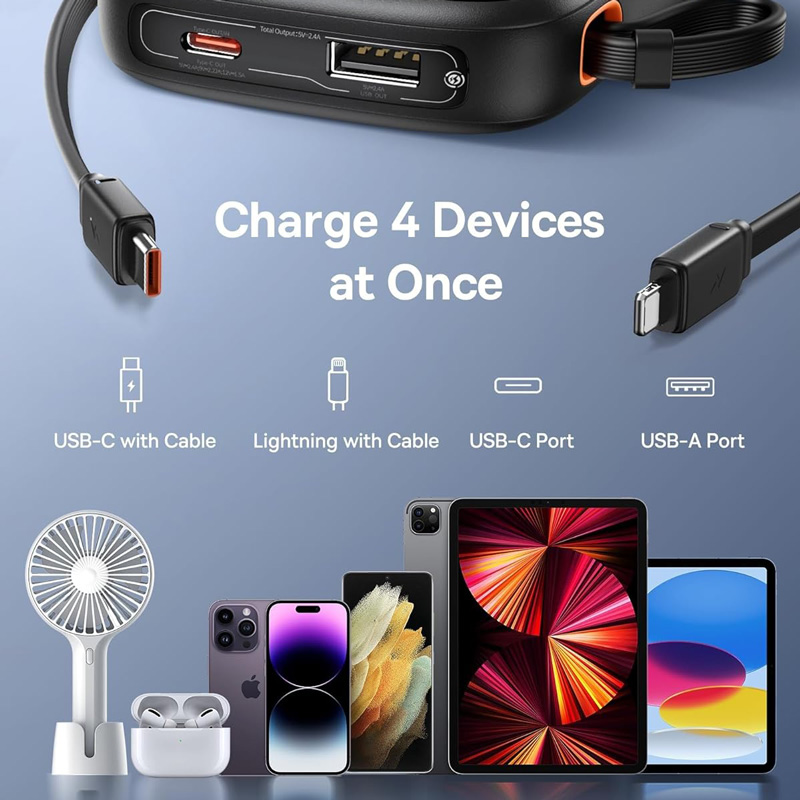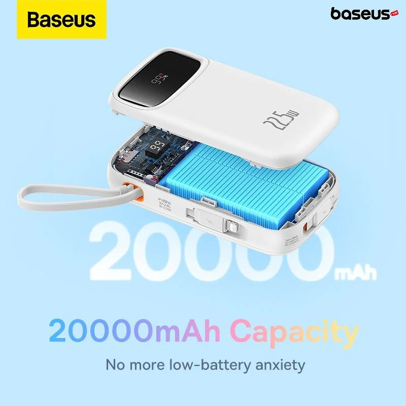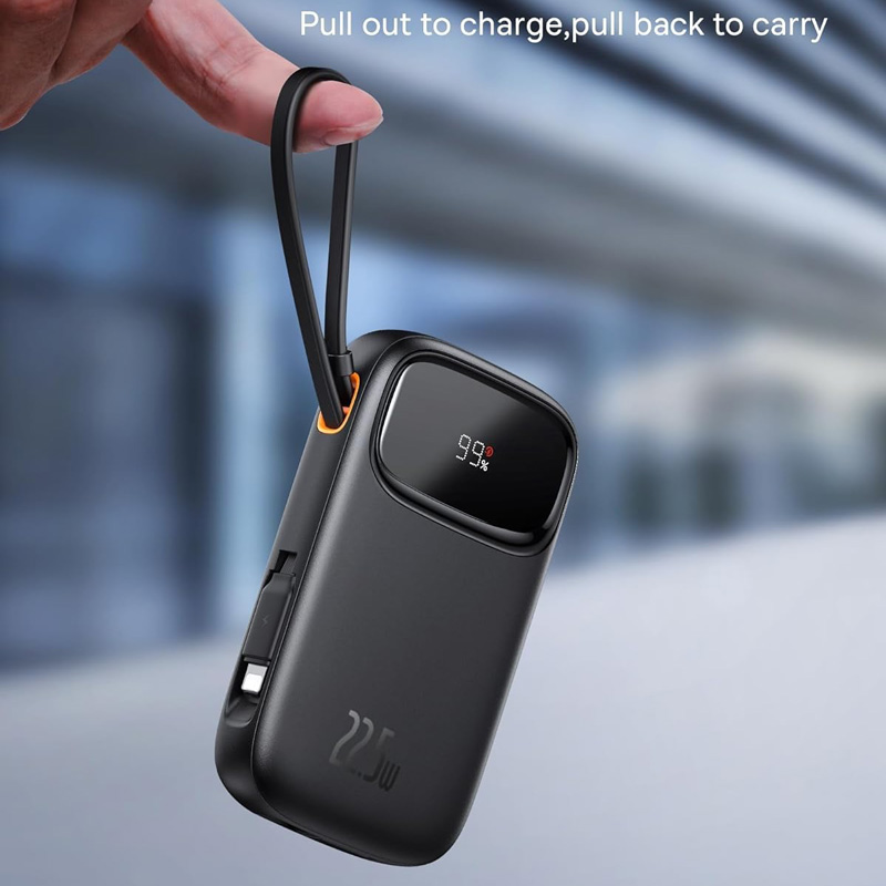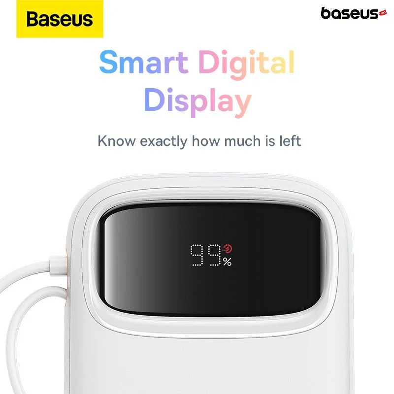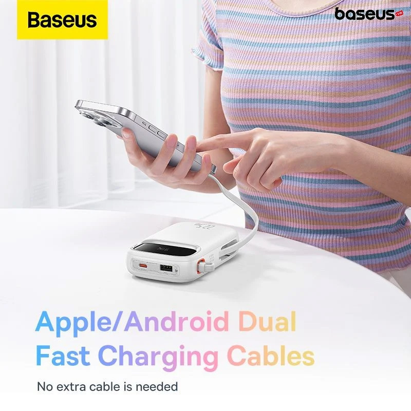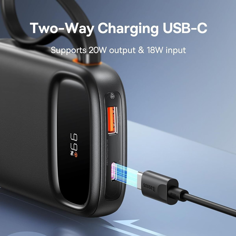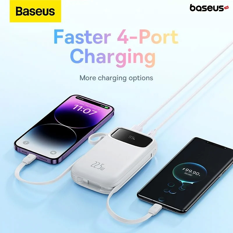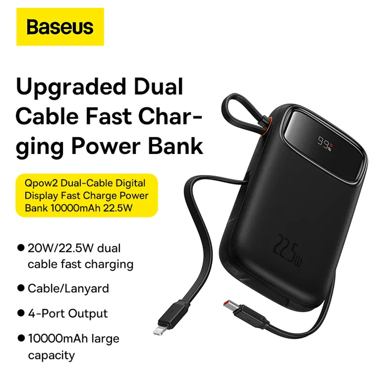 پاوربانک بیسوس Qpow 2 با دارا بودن یک کابل لایتنینگ به همراه یک کابل با کانکتور USB C متصل به بدنه و یک درگاه USB-A , USB-C به شما امکان می دهد تا حداکثر 4 دستگاه را به طور همزمان شارژ کنید. کابل LIGHTNING می تواند گوشی آیفون 14 شما را با توان 2O وات و گوشی سامسونگ S 23 یا آیفون 15 را با توان 22.5 وات شار نماید. علاوه بر این، شارژر دارای خروجی های USB و USB-C است که به شما امکان می دهد برق چندین دستگاه مختلف را به طور همزمان تامین کنید. این شارژؤ همراه دارای نمایشگر از پروتکل های SCP، FCP، QC و PD پشتیبانی می کند و تنها در 30 دقیقه باتری گوشی Samsung S23 تان را تا 50 درصد شارژ می نماید.