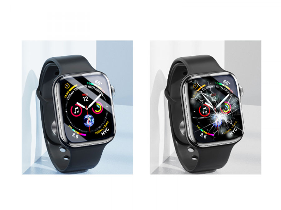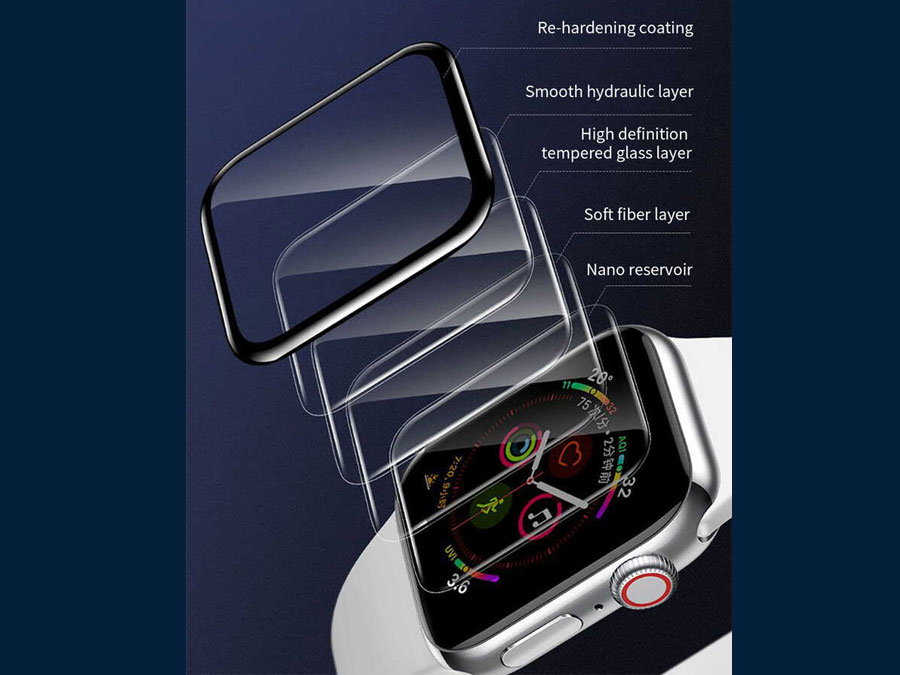 این لوازم جانبی اپل واچ از جنس شیشه سکوریت بوده و از سختی 6H برخوردار است تا در صورت وارد شدن ضربه خورد نشود. به صورت کامل صفحه نمایش را پوشش میدهد و لبههای خمیدهای دارد و حاشیه مشکی رنگ اطراف آن را پوشانده است.