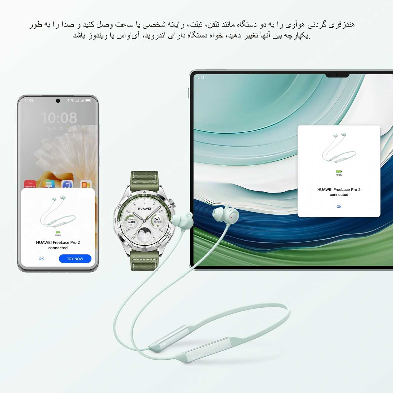 یکی از ویژگیهای جذاب هندزفری وایرلس HUAWEI FreeLace Pro 2، اتصال دو دستگاه به طور همزمان است که به شما امکان میدهد به راحتی بین دستگاههای مختلف جابجا شوید. این هندزفری قادر است به دو دستگاه مانند تلفن همراه، تبلت، رایانه شخصی یا حتی ساعت متصل شود و به شما اجازه میدهد بدون نیاز به قطع اتصال، به طور یکپارچه صدا را بین آنها تغییر دهید.