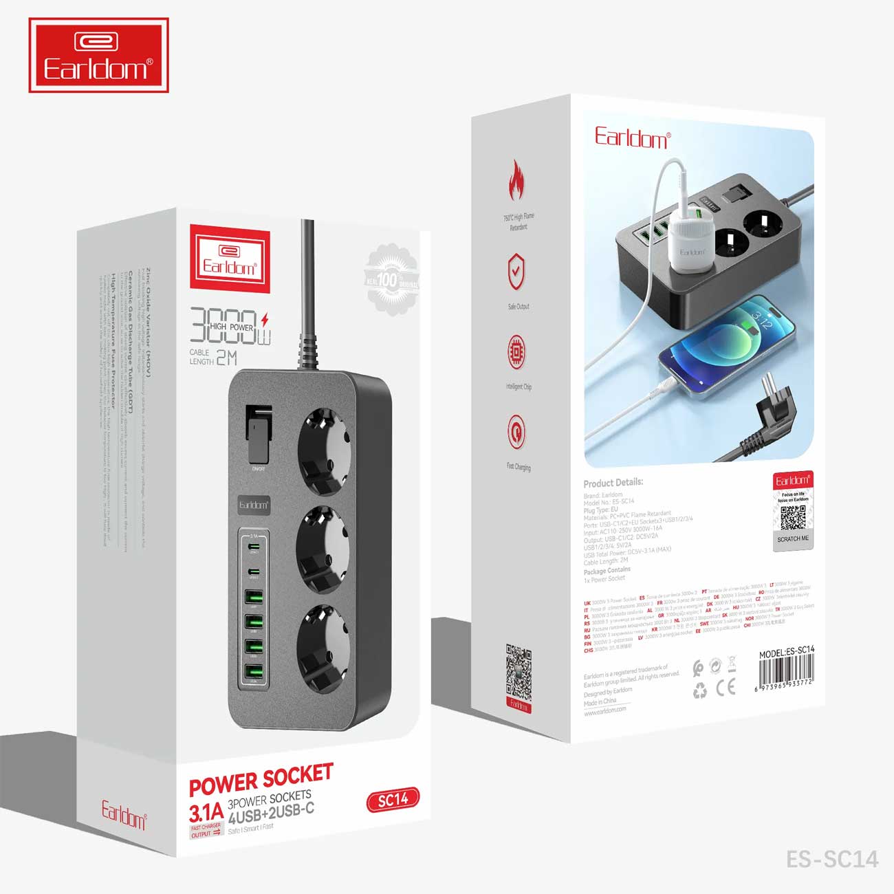 ES-SC14 سه سوکت برق، چهار درگاه USB و دو پورت Type-C طراحی شده است تا نیازهای مختلف شما برای تامین انرژی دستگاههای الکتریکی و دیجیتال را به راحتی برآورده کند. این ترکیب متنوع از پورتها، به شما امکان میدهد تا به طور همزمان چندین دستگاه با انواع نیازهای شارژ و اتصال را به یک پریز برق وصل کنید.