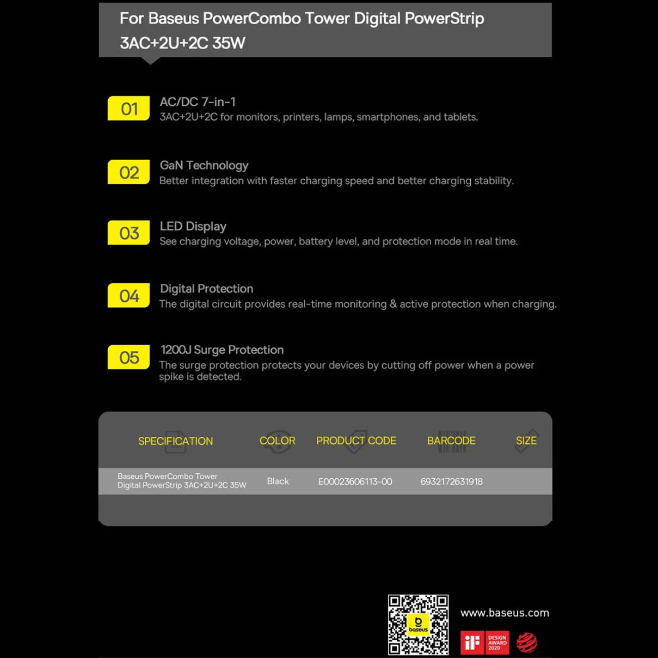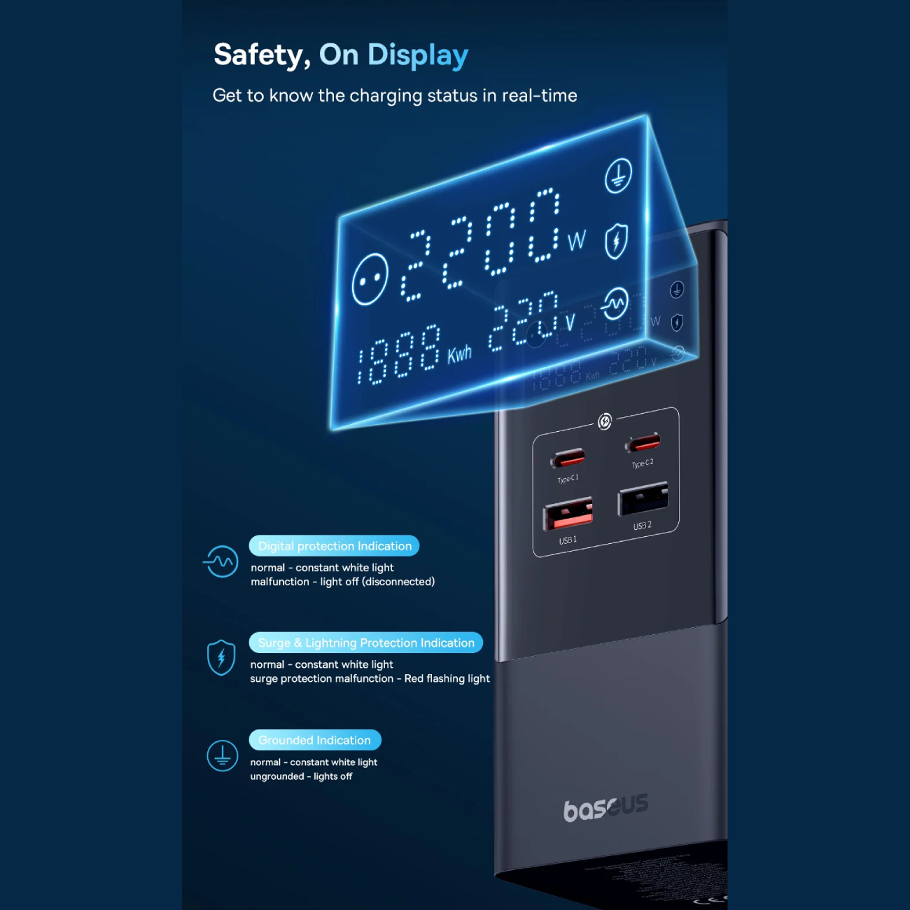 از ویژگیهای جذاب هفت راهی برق Baseus PowerCombo BS-E00023606113-00، نمایشگر LED آن است که وضعیت شارژ، ولتاژ و توان دستگاه را به طور زنده به شما نمایش میدهد. این ویژگی به شما این امکان را میدهد که با اطمینان و دقت بیشتری از وضعیت دستگاههای خود مطلع شوید.