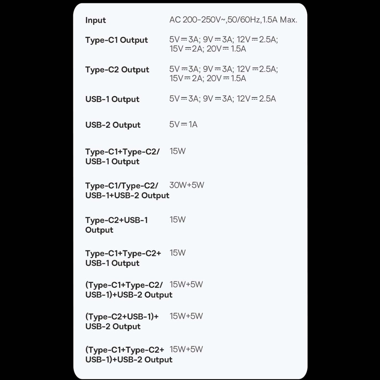 Type-C1/Type-C2 Output: 5V=3A; 9V=3A; 12V=2.5A; 15V=2A; 20V=1.5A
