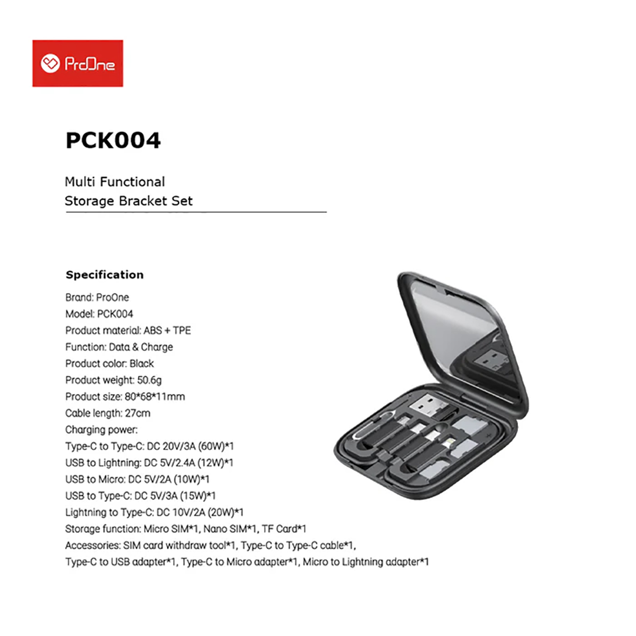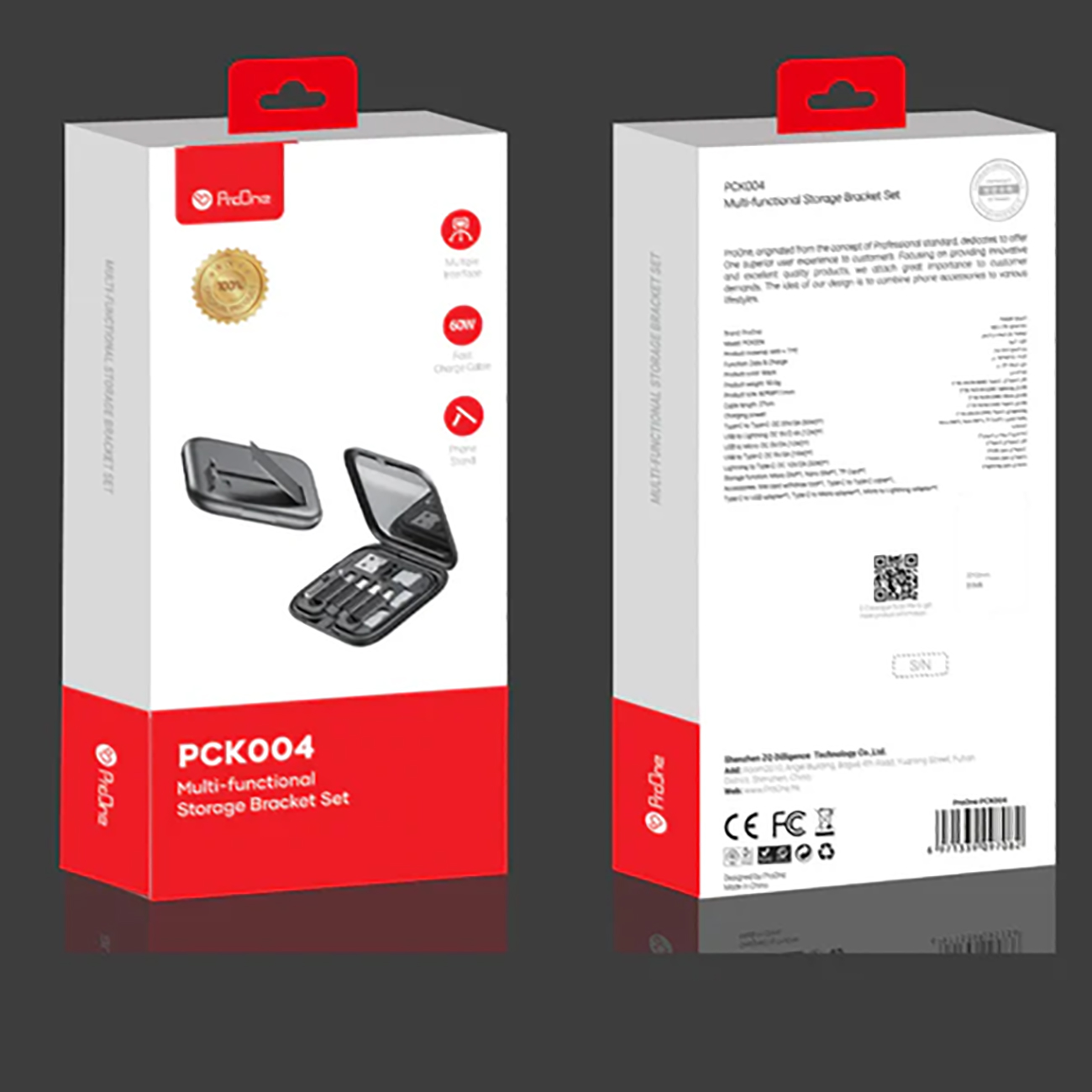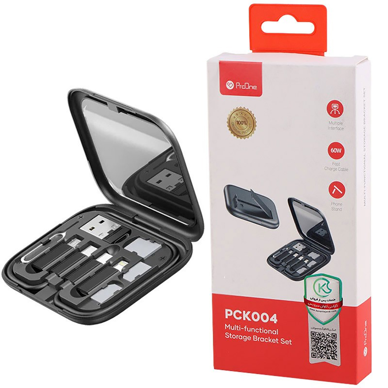 پک ذخیره سازی ProOne PCK004 به شما این امکان را میدهد تا 6 دستگاه مختلف را شارژ کنید؛ در این پک یک کابل دوسر تایپ سی، تبدیل یو اس بی به لایتنینگ ، یو اس بی به میکرو یو اس بی ، یو اس بی به تایپ سی و کابل تایپ سی به لایتنینگ قرار دارد.