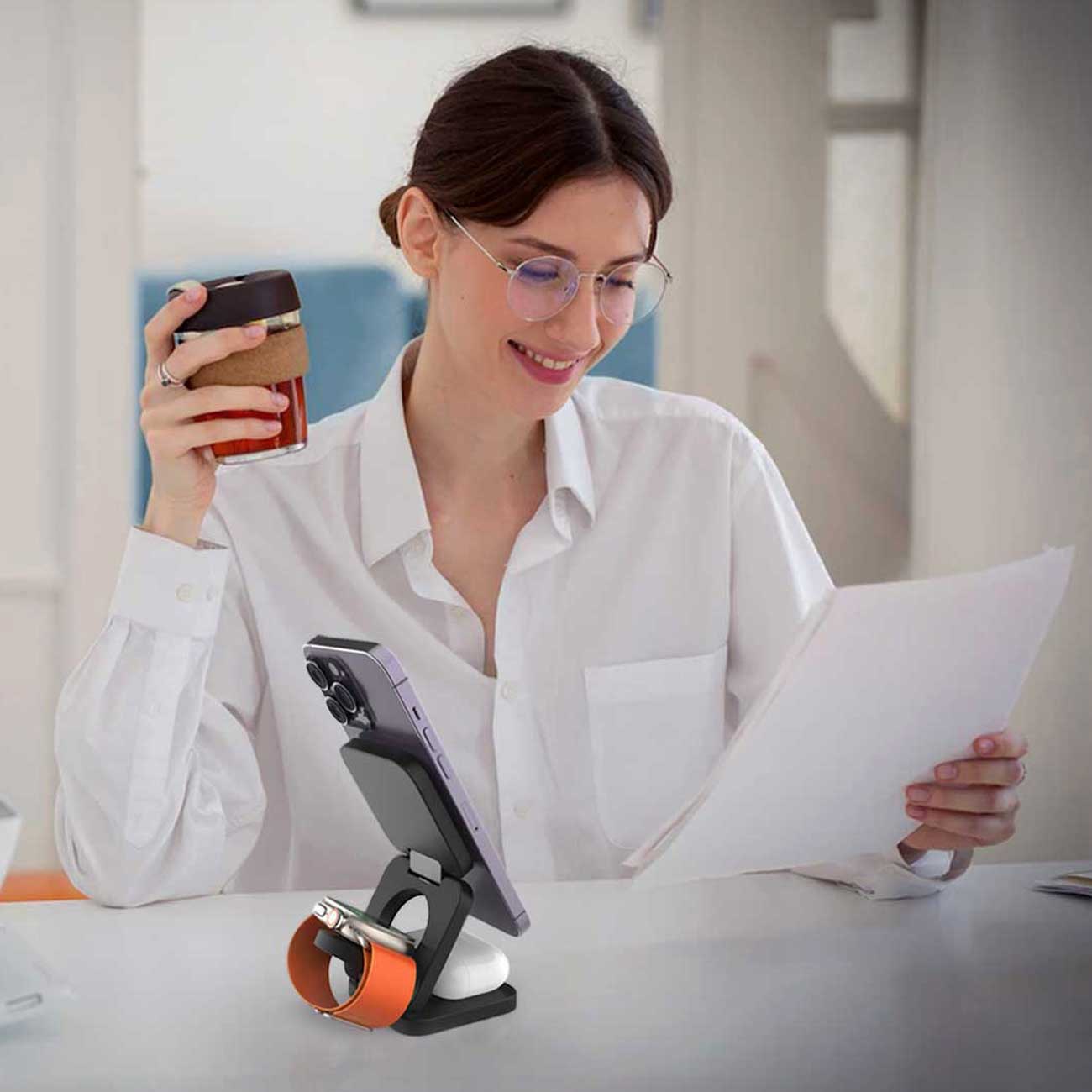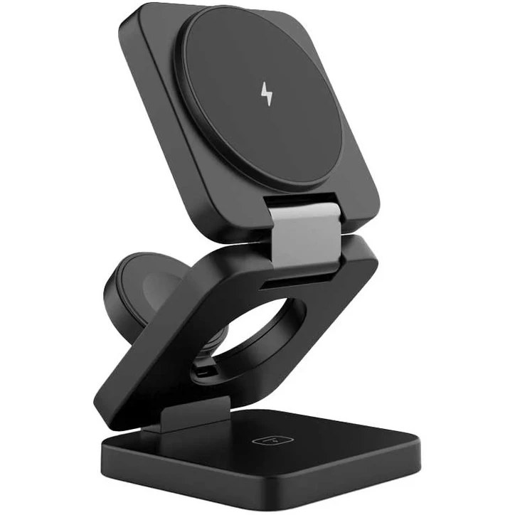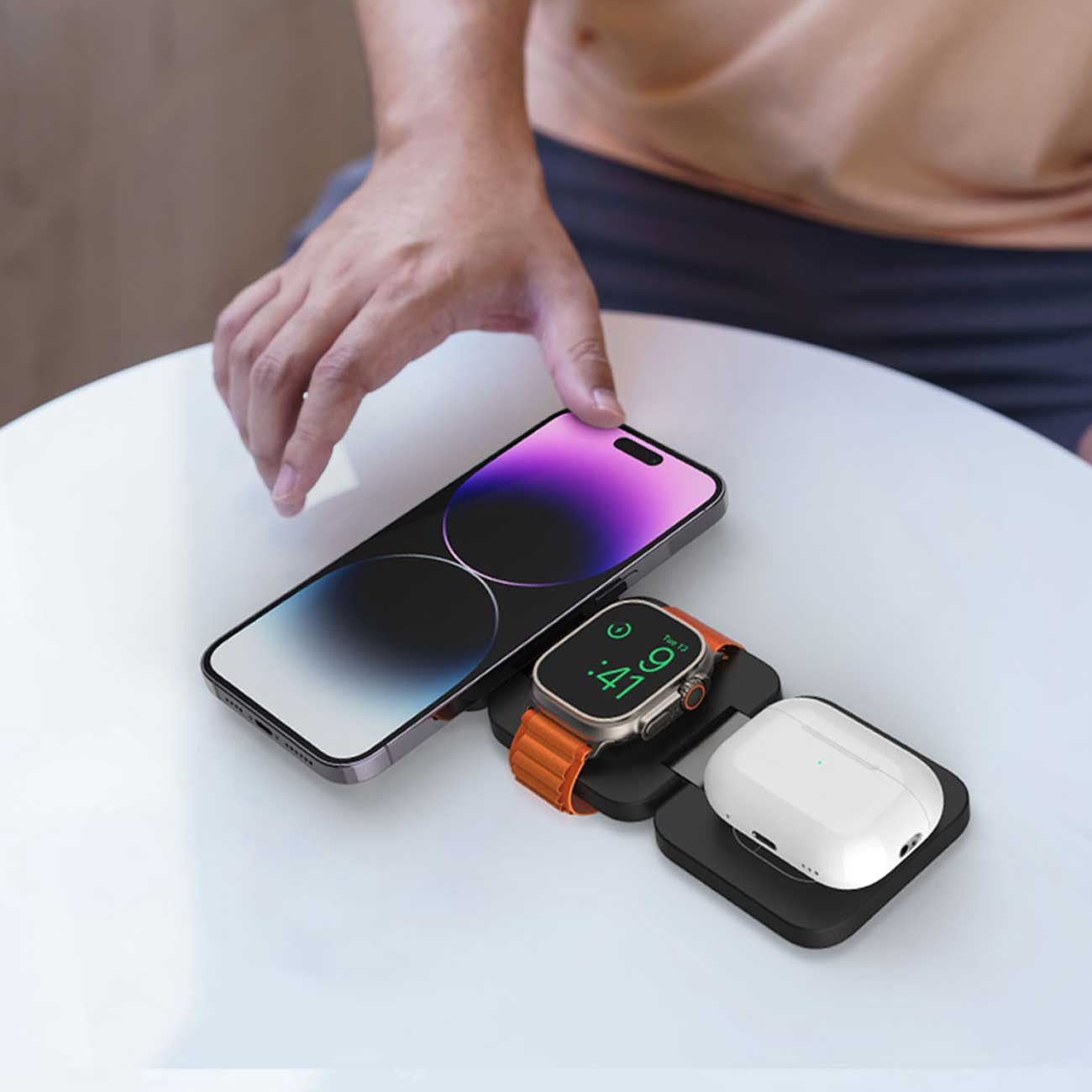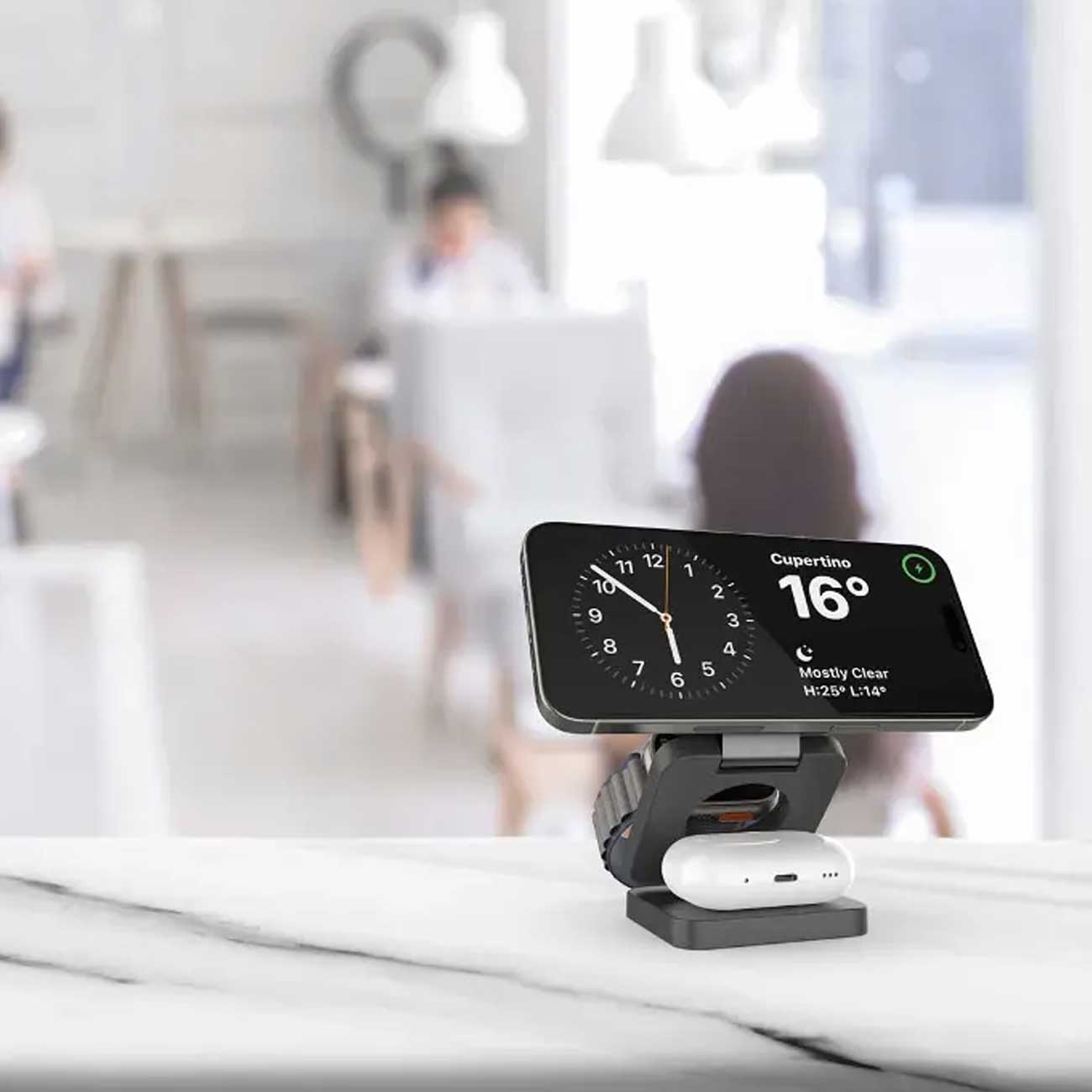 استند و شارژر بی سیم آیفون 15 وات سه کاره رومیزی تاشو پرودو PD-3N1MWFC-BK