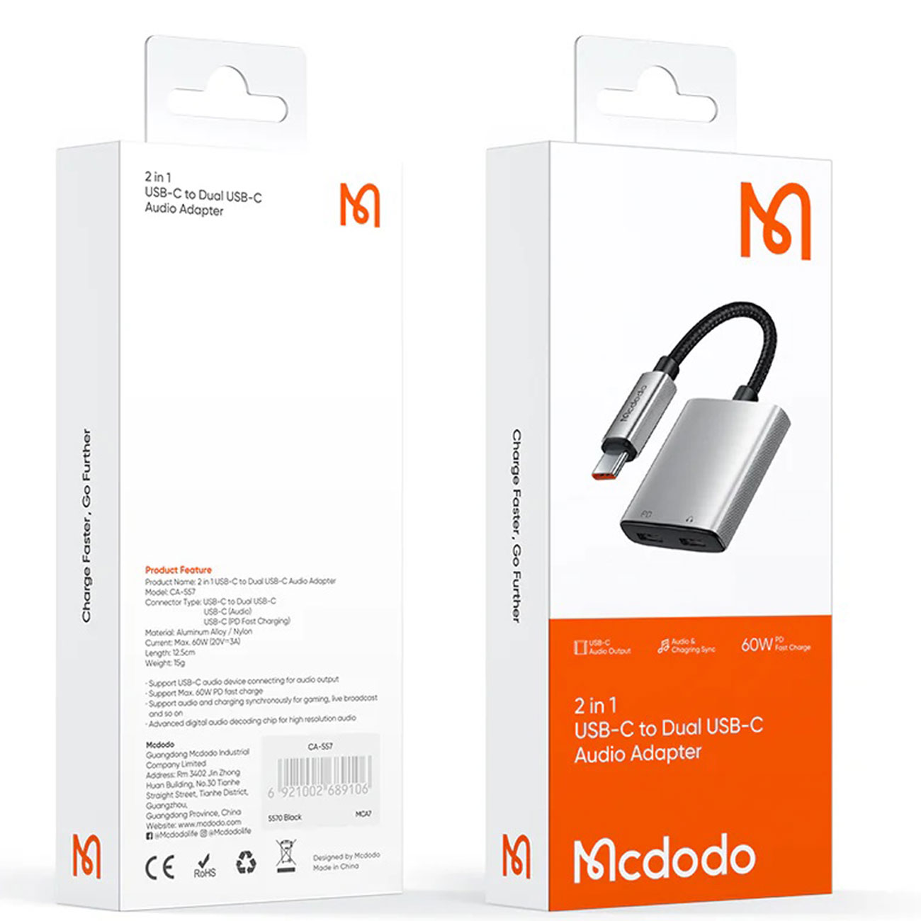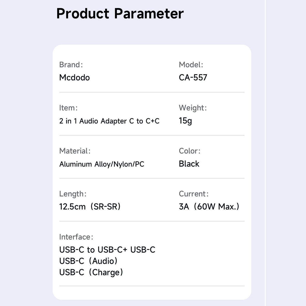 مبدل تایپ سی مک دودو همگام سازی کامل بین دو دستگاه با انتقال سریع و ایمن دادهها را فراهم میکند. هنگام گوش دادن به موسیقی یا برقراری تماس تلفنی با Mcdodo CA-557، فرصت شارژ دستگاه خود را از دست ندهید. توان شارژ آن 2.4 آمپر و خروجی 5 ولت و سرعت شارژ در این مبدل 60 وات است. CA-557 با فناوری تراشه هوشمند و مواد با کیفیت بالا، یک لوازم جانبی ضروری برای شما خواهد بود!