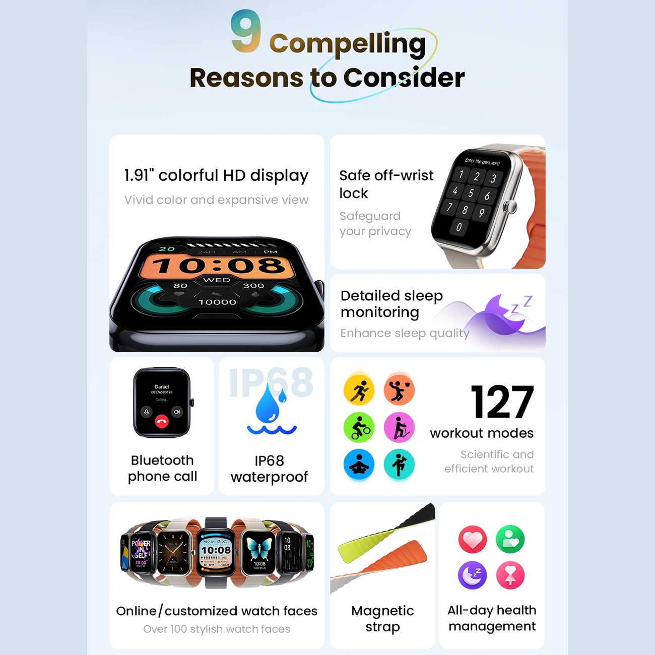 | سایر ویژگیها | پخش کننده موسیقی، اعلان های پیام و تماس و پایش چرخه قاعدگی خانمها،پایش خواب، بیش از 100 واچ فیس |